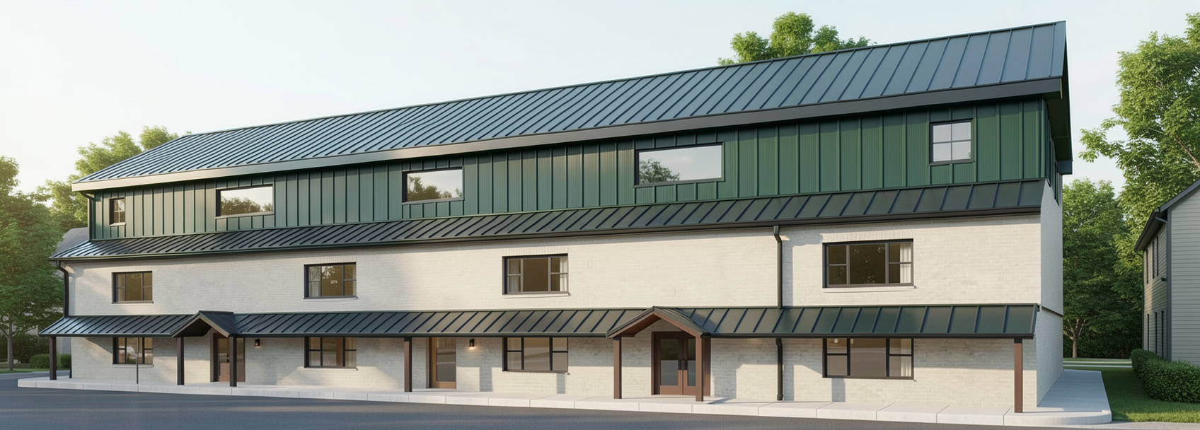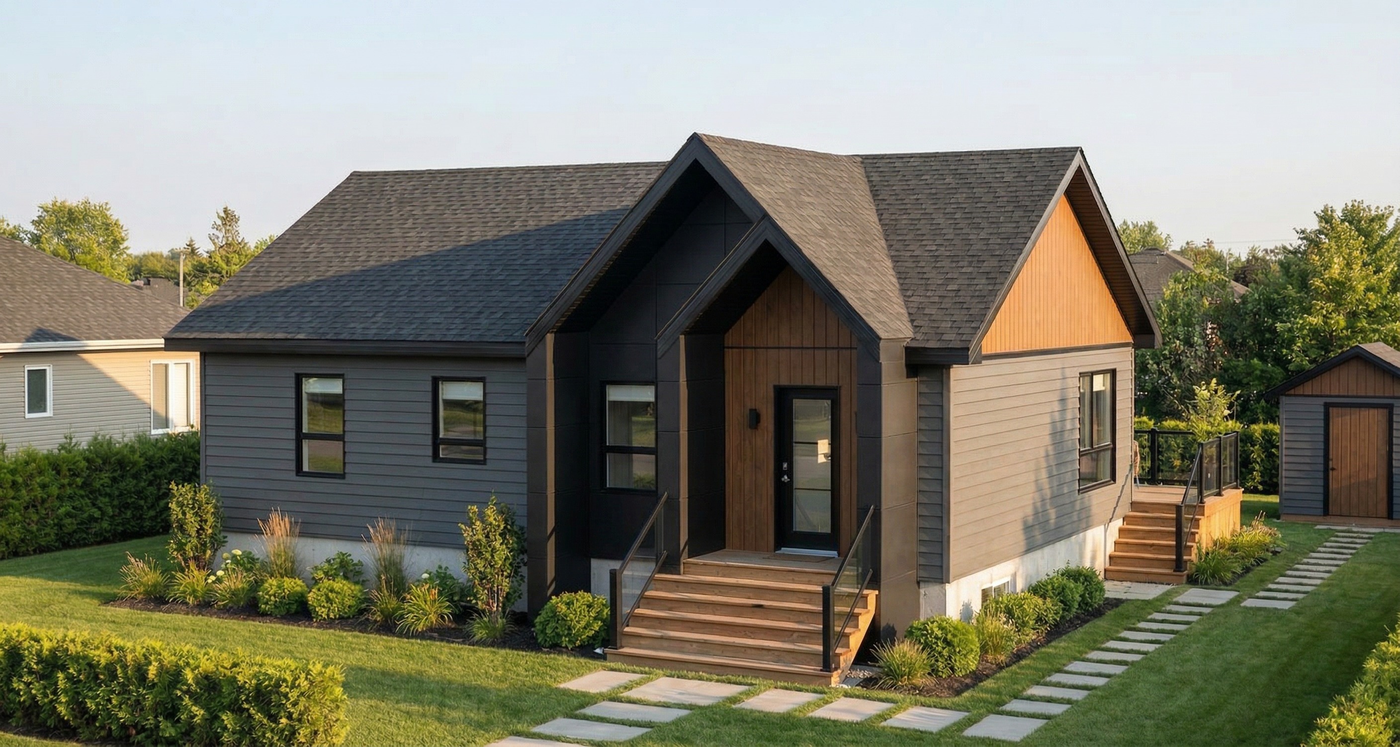keep everything exactly as in the original image do not change the architecture volumetry layout windows doors roof wall claddings colors landscaping or lighting the only modification is to replace the fascia on the two gables at the main entrance with fiber cement instead of aluminum do not modify any other fascia elements on the building only the two entrance gables are concerned the new fiber cement fascia must match the same black color tone as the existing fascia and soffit maintain a clean modern look and ensure a realistic high quality architectural render