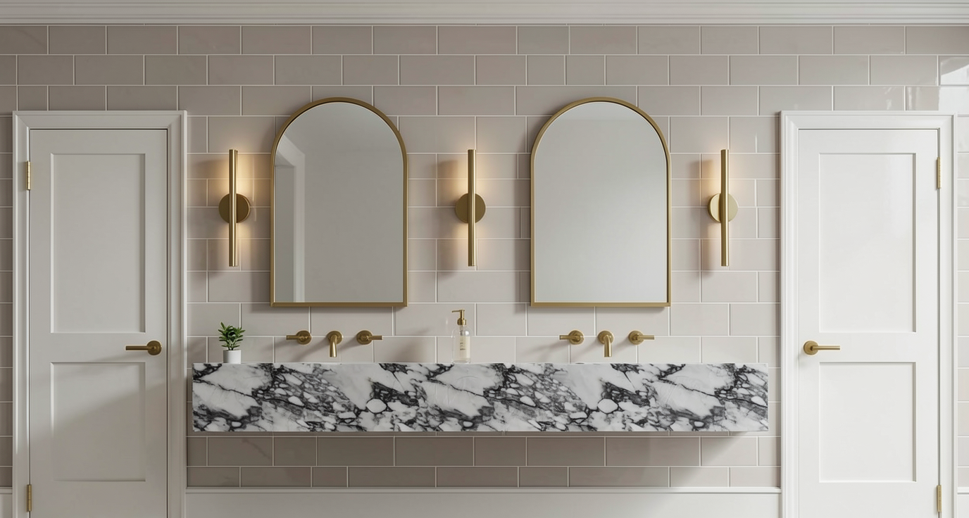 elevation with two white doors on each side with gold hardware large slab wall mount sink with dark grey veining two wall mounted gold faucets 3 gold scones on the wall in between two large gold arched mirrors add crown molding wall is full floor to ceiling subway tiles that is a variations of green color with gloss finish and vertical lay have grout match the color of tile have view be a flat elevation view no perspective