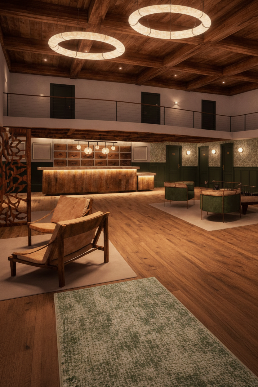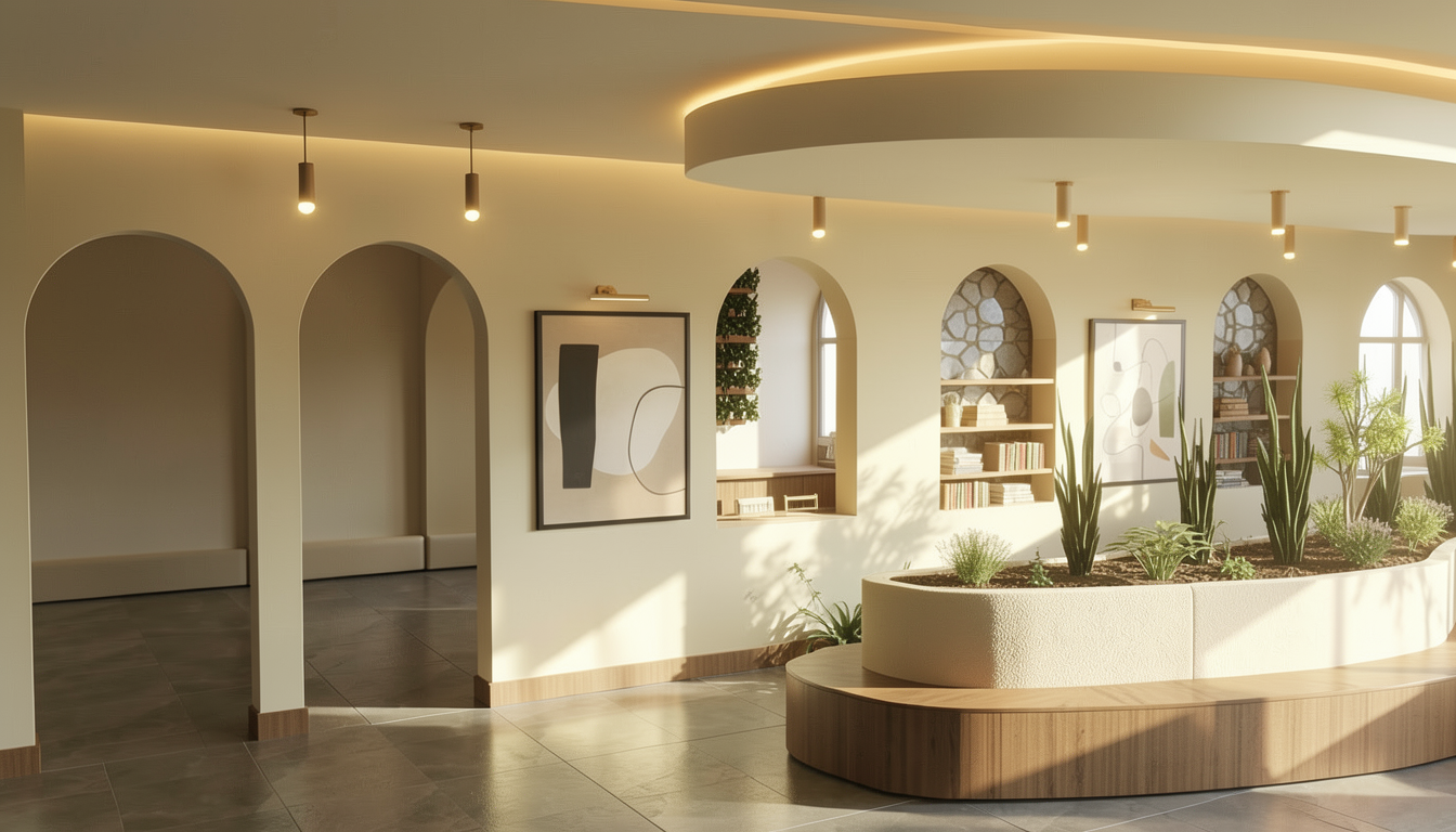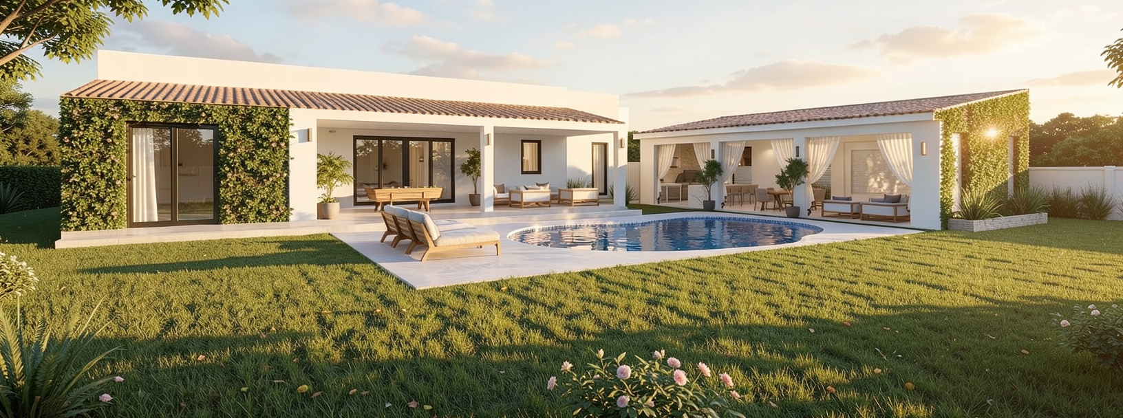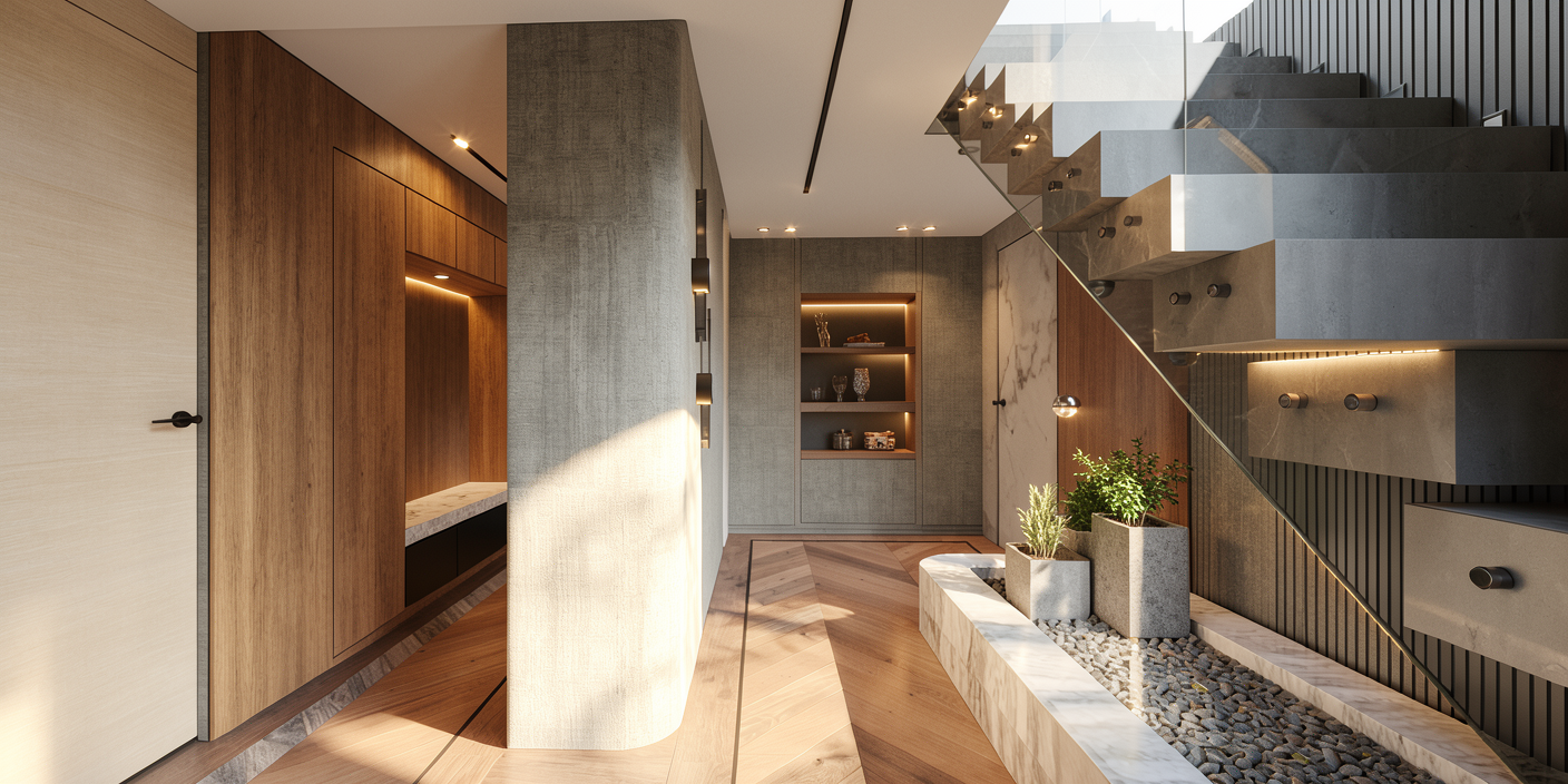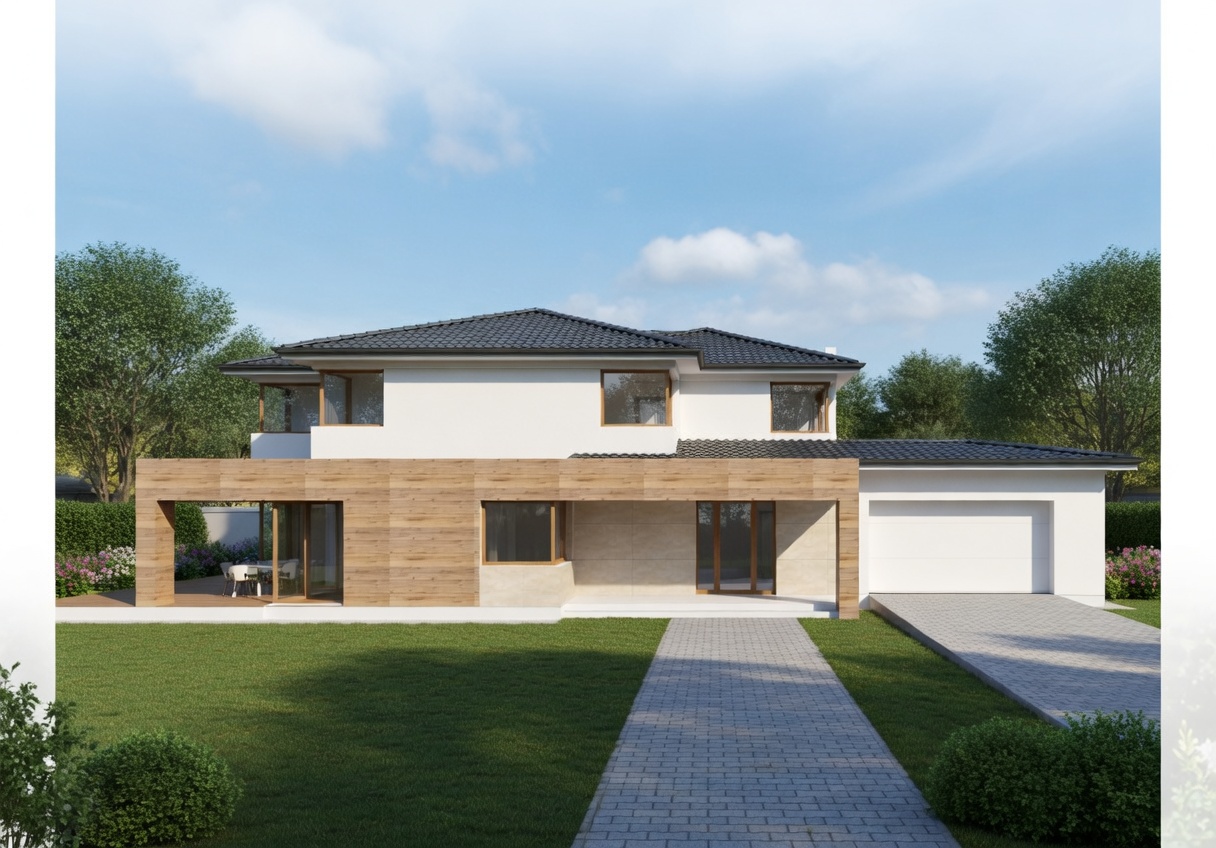 modern single family house facade minimalist architecture beige exterior walls combined with natural wood elements clean lines large windows elegant and warm color palette contemporary design realistic lighting high detail daytime soft shadows landscaped surroundings