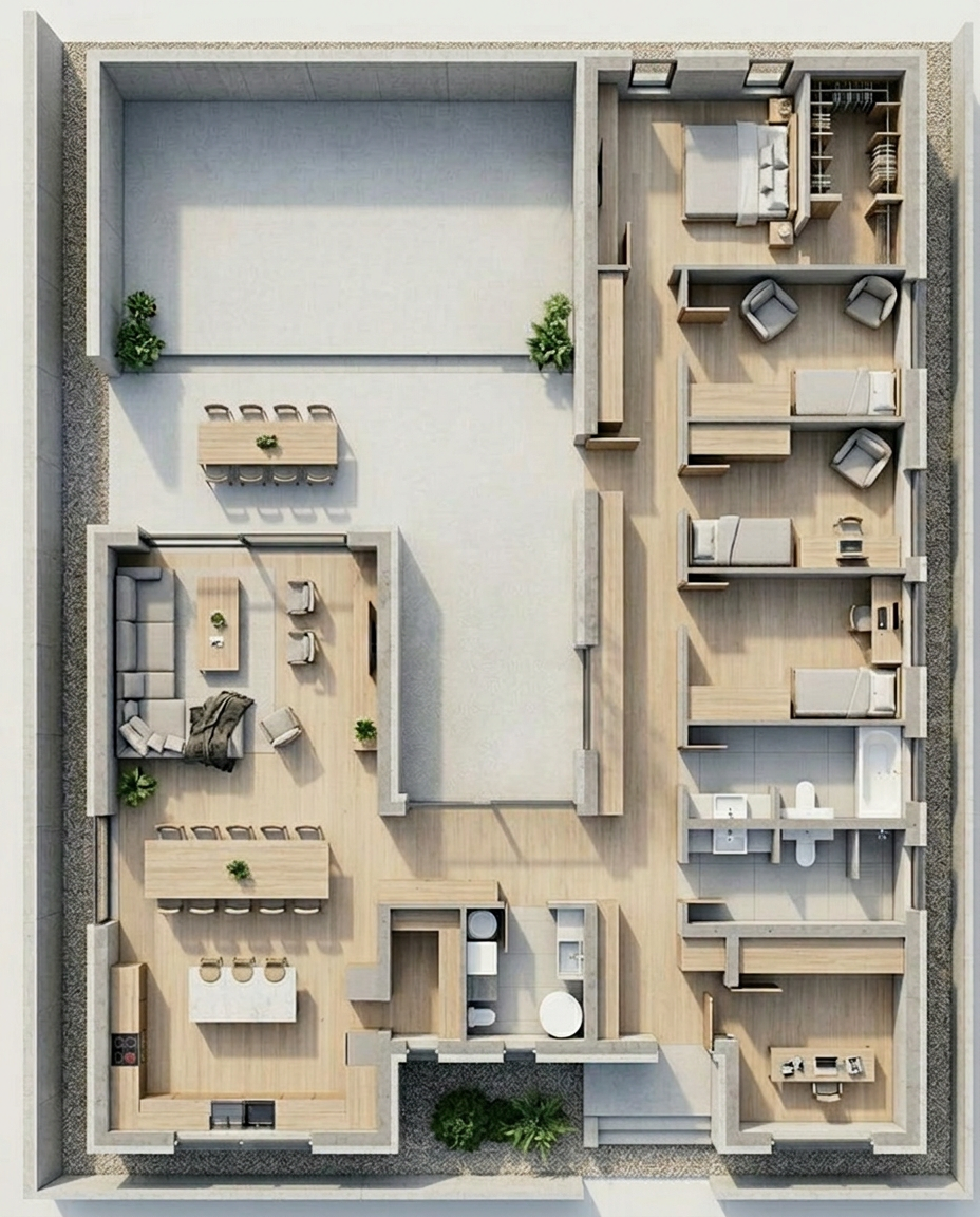 reimagine this house as a modern architectural exterior with smooth white stucco walls a deep dark grey roof and dark grey posts highlighting the entrance render in bright midday sunlight with realistic shadows global illumination natural sky lighting and a lightly landscaped front yard with green lawn small shrubs and a concrete pathway ultra realistic high detail 4k resolution