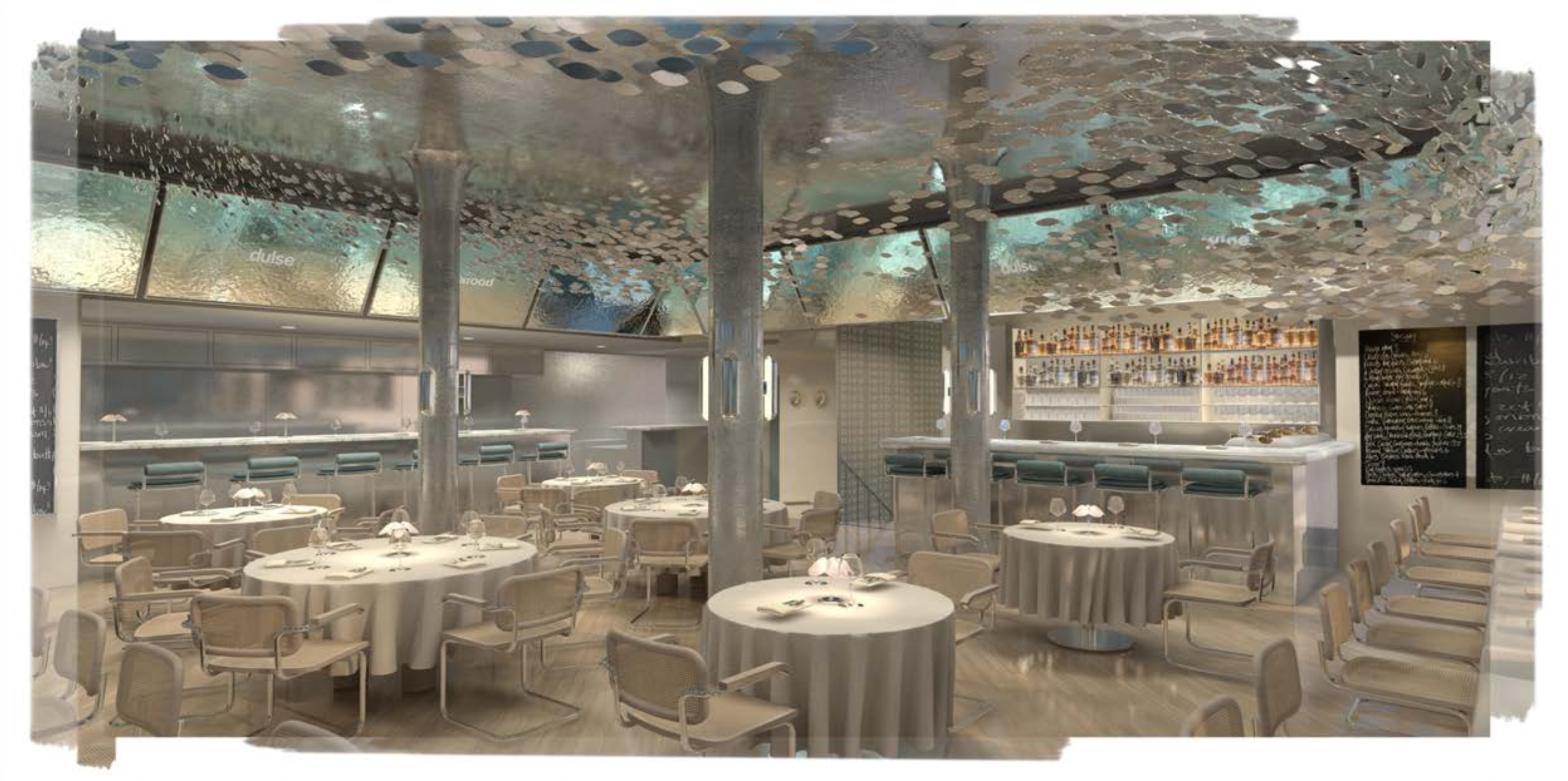 exterior shot interior shot modern restaurant interior use materials and furniture style from moodboard