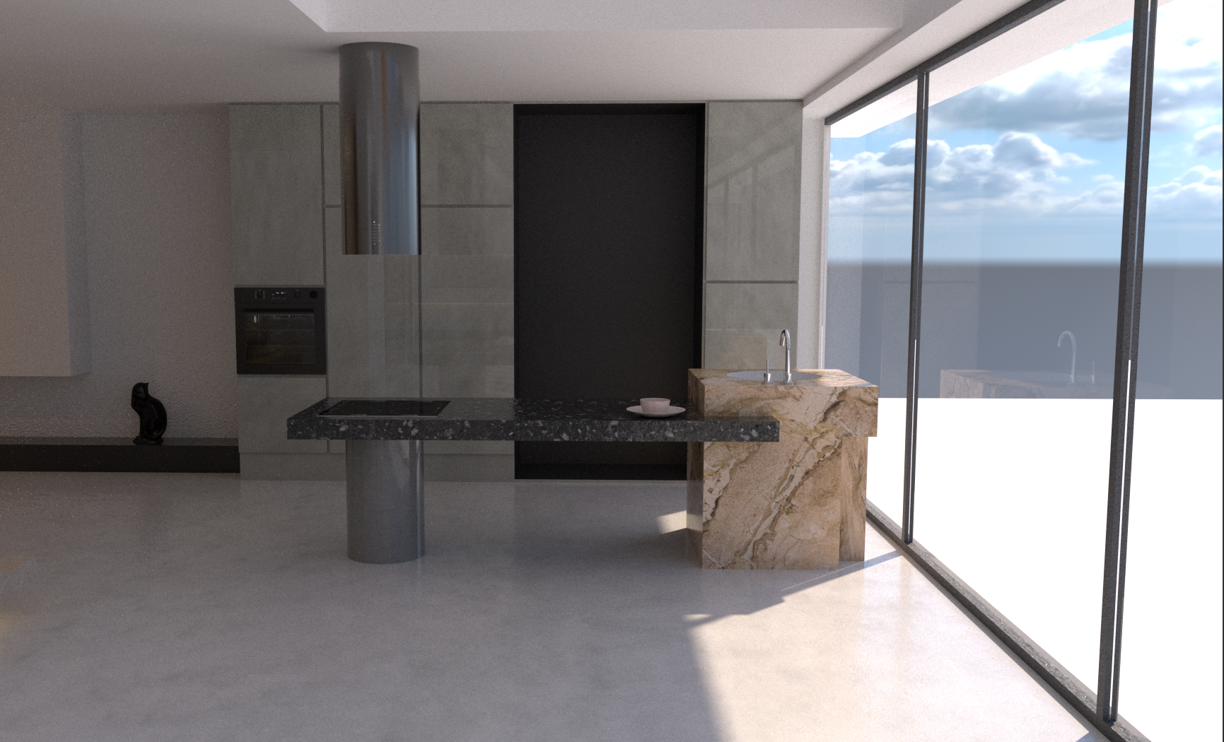 modernist interior shot add dense vegetation forest outside the glass architecture