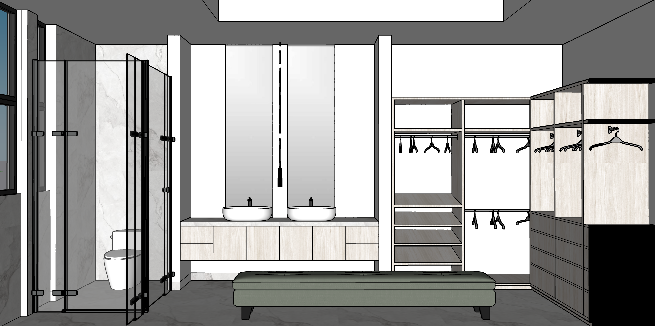 modern master bathroom and walk in empty closet interior render contemporary minimalist design with soft neutral palette light oak cabinetry matte black fixtures and matte white walls double vanity with vessel sinks and large vertical mirrors glass enclosed shower and toilet area on the left open wardrobe and shoe shelves on the right and an upholstered green bench in the center light gray porcelain tile on the floor natural light from ceiling skylight soft reflections realistic materials clean lines and a photorealistic architectural rendering style