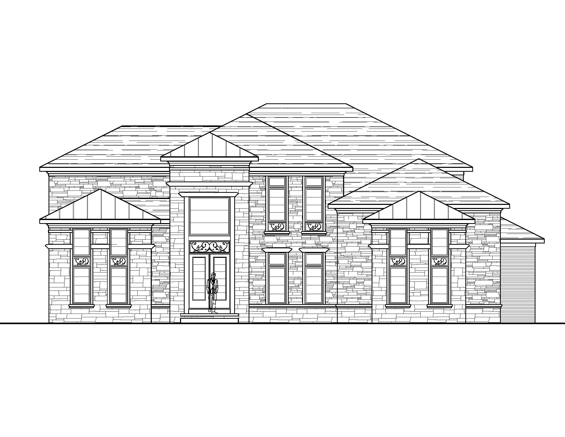 6pm evening a modern two story house with a sleek design and hip roofs featuring sand colored stone with black window frames the roof is a dark charcoal color adding contrast large windows dominate the facade reflecting the clear blue sky w a few clouds surrounding the house a lush green lawn with a few colorful flower beds in shades of pink lavender and yellow lansdcape stones dot the yard framing the plantings the atmosphere is serene and welcoming with evening sunlight casting gentle shadows do not modify the massing as shown