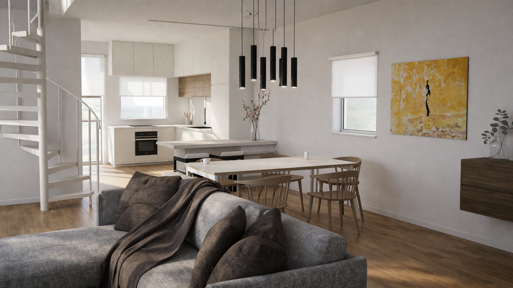 create a modern minimalist living and dining space with a calm and inviting atmosphere use warm natural tones throughout render a cozy grey sofa adorned with deep brown cushions and a matching throw blanket the flooring is medium toned wood adding warmth to the room include a sleek white spiral staircase leading to an upper level the walls are a soft light grey providing a neutral backdrop centralize a long dining table with light wood chairs and a simple white tabletop illuminate the space with black cylindrical pendant lights add a splash of color with a vibrant yellow abstract painting on the wall place a glass vase with delicate pink and white blossoms on the dining table the large windows should stream in natural light creating a bright and airy atmosphere finish with a wooden side cabinet and a small glass vase with green foliage for a touch of nature