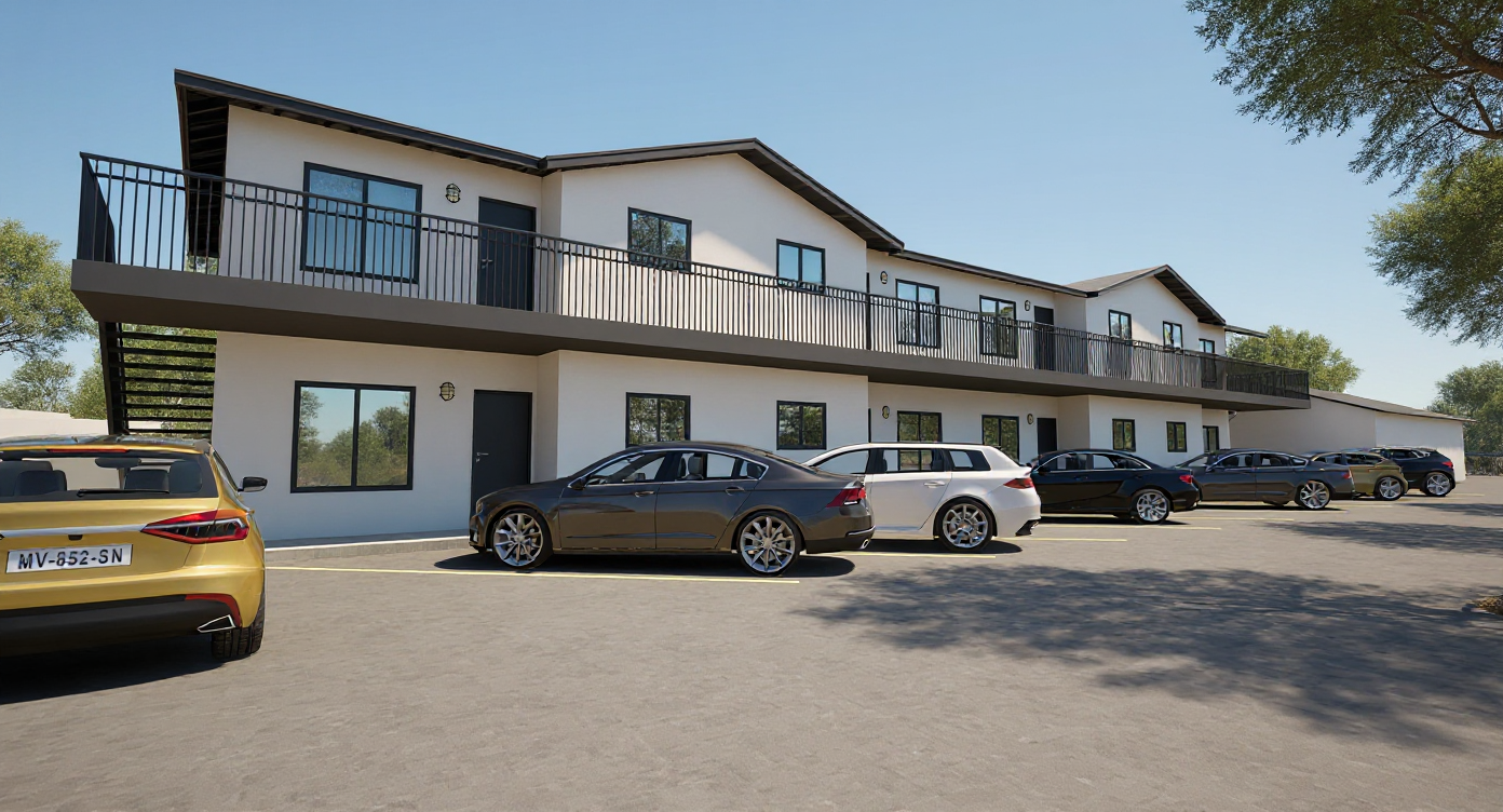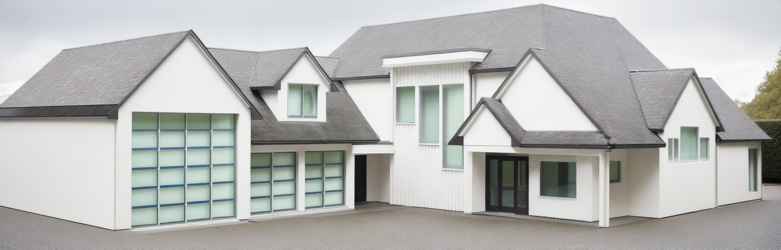 white smooth cement plaster walls black steel railings black deck black roof with black exposed rafter tails california landscape and oak trees afternoon sunny day setting