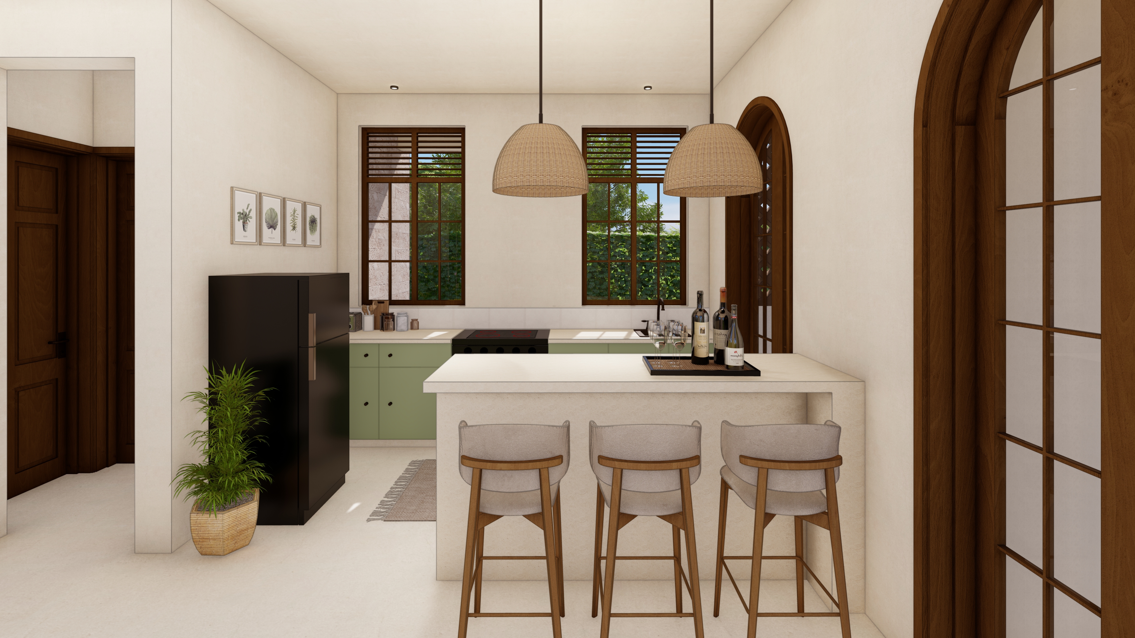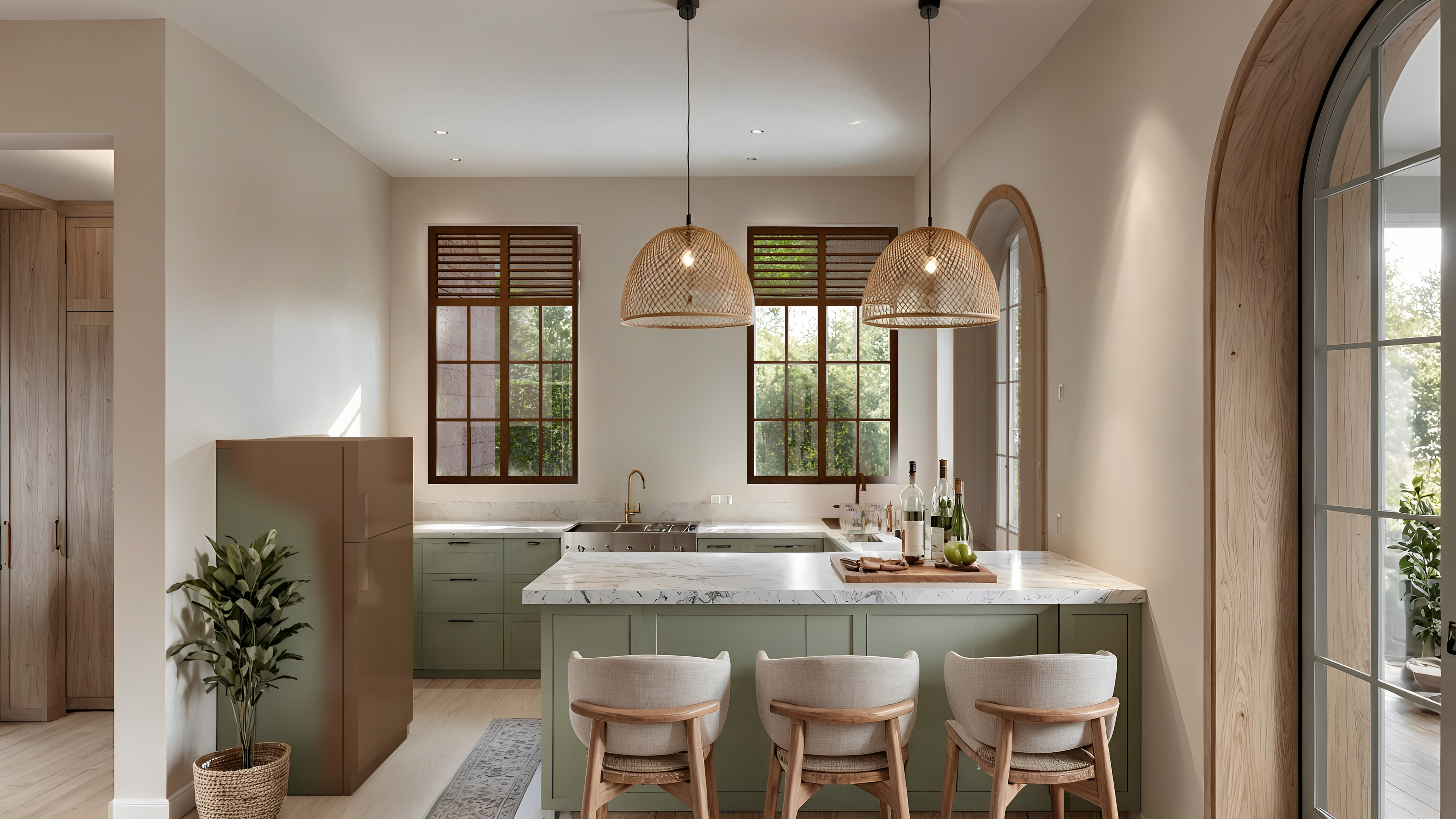 detail shot beautiful interior of a modern coastal kitchen with beige plaster floors island and worktops white walls and ceiling grey metal fridge on the left green kitchen counters wooden doors and windows light wood and cream bar stools wicker hang lights above the beige island
