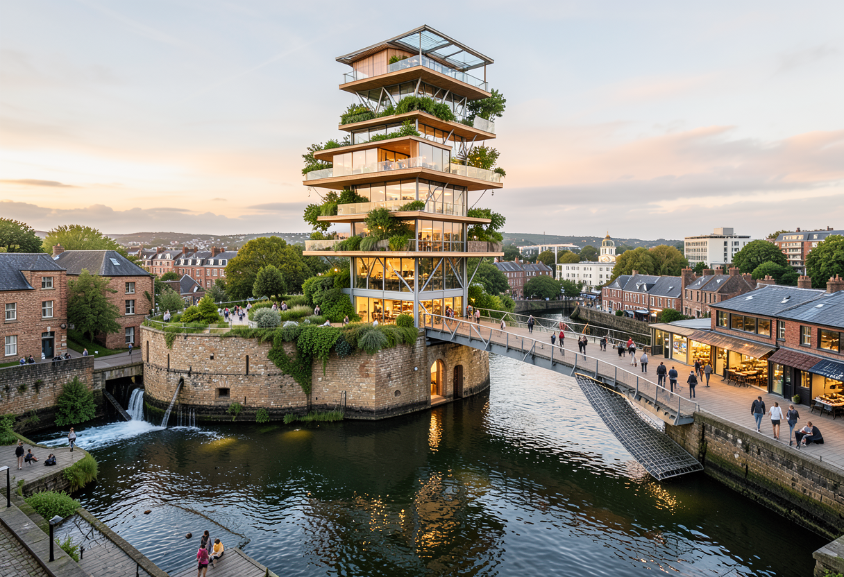 replace the setting of the tower with the chester river dee setting of reference image the tower sits directly on the hydro building which is captured on the reference image and features large black arch