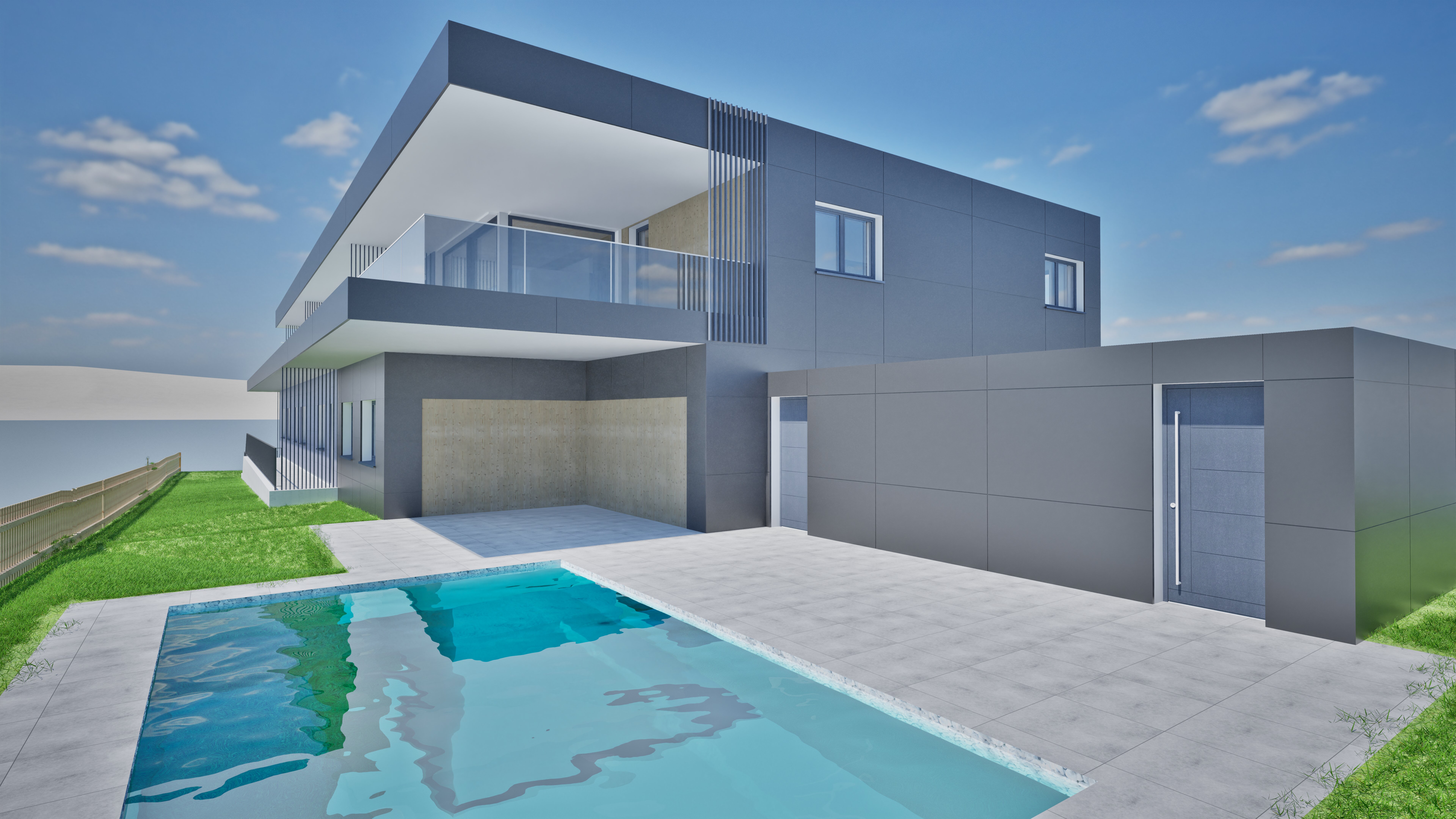 exterior shot kein zaun im hintergrund fassadenplatten dunkel bis schwarz