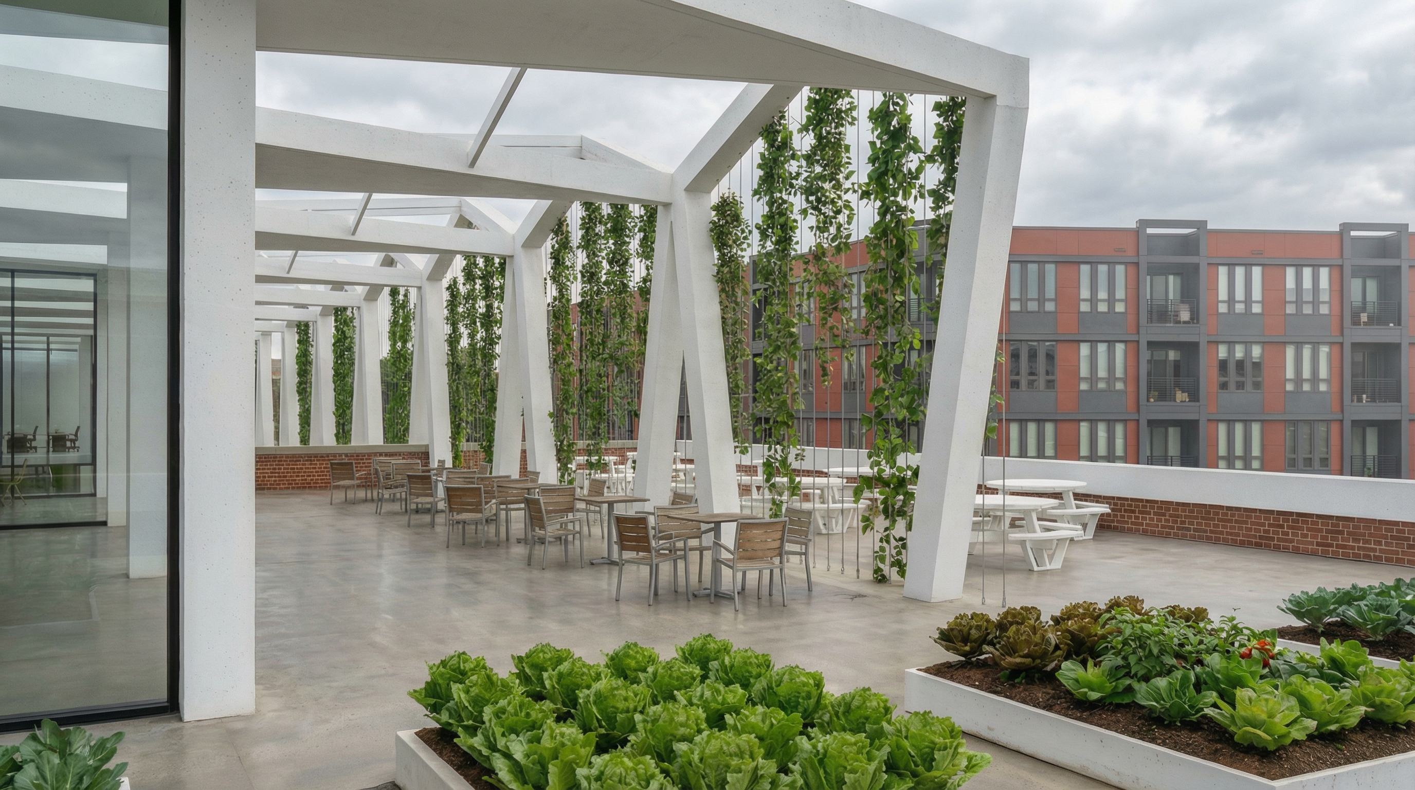 do not change the size shape proportions angle height or position of any planter box all planter boxes must remain exactly the same dimension and in the exact same coordinates do not crop zoom distort or rescale any part of the image only modify the plants inside the boxes update only the vegetation add realistic plant variety herbs leafy greens kale chard basil rosemary peppers tomatoes scallions keep variety in every box including the far right preserve the soil level and planter edges exactly as shown do not add plants outside of the boxes do not adjust lighting structure tables chairs vines or background building everything outside the plants must stay pixel identical to the base image