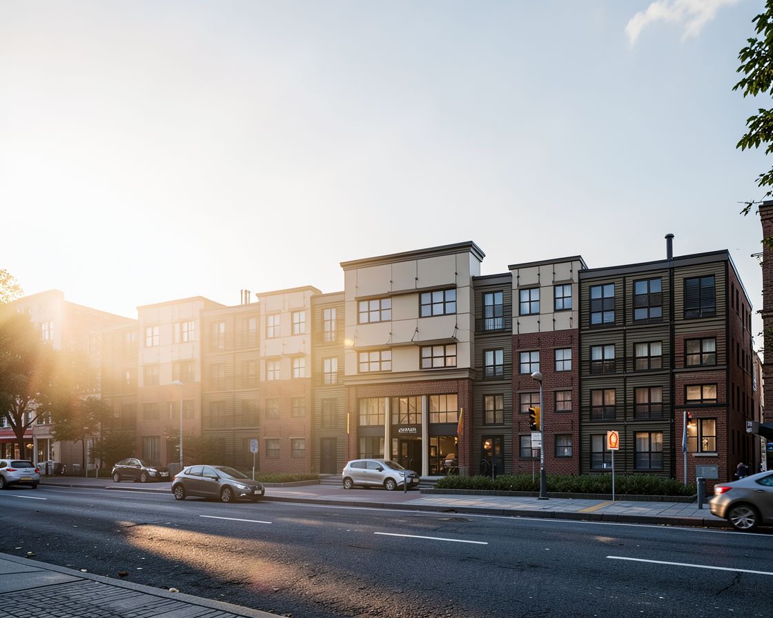 make photorealistic with no visible light source shadows should fall to the right keep colors and textures as close to original as possible small amount of landscaping in front of building quiet suburban in foreground 30 feet from face of building