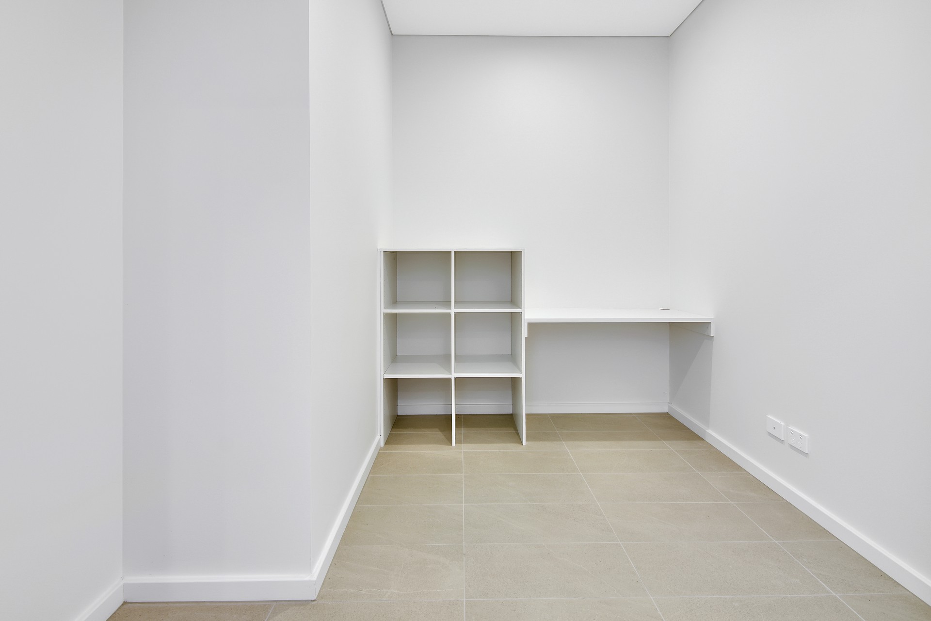 add a beige study chair under the table and a macbook on the table add some books in the shelf