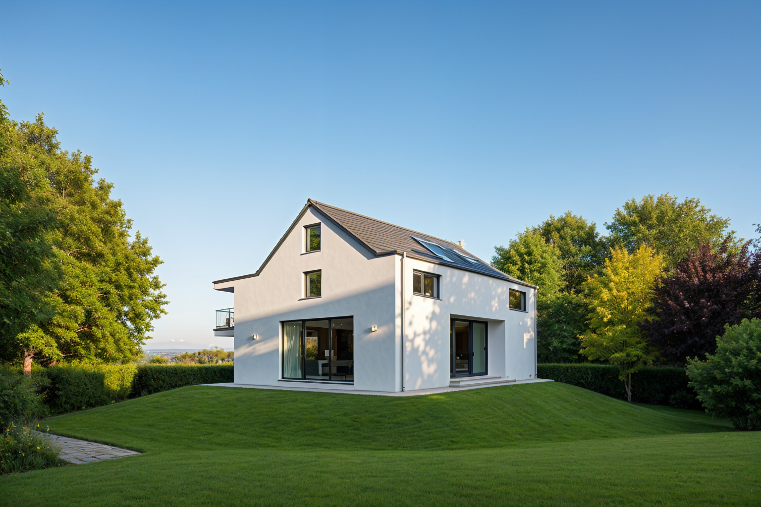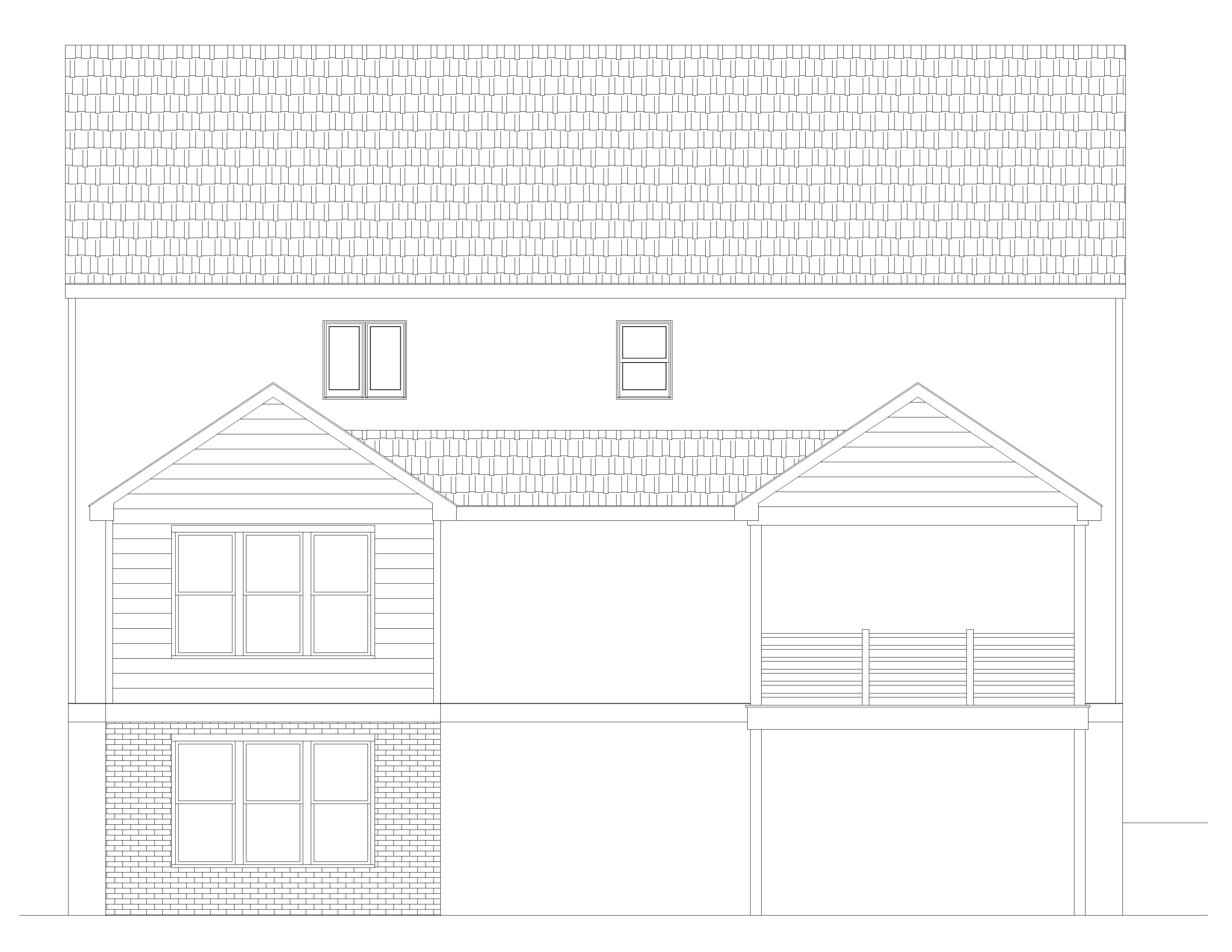 generate a beautiful rear elevation rendering of a two story house with a basement with a warm and inviting atmosphere the house features a modern design with a gable roof use soft pastel colors for the walls such as a gentle sage green and white trim for the edges and corners the roof should have a light grey tone with subtle shading to show depth the windows should have white frames and light reflecting glass set the scene during a serene golden hour with a partly cloudy sky casting a peaceful warm light across the house include a well maintained garden in front with lush green grass and colorful flowers like lavender and daisies to enhance the tranquil atmosphere