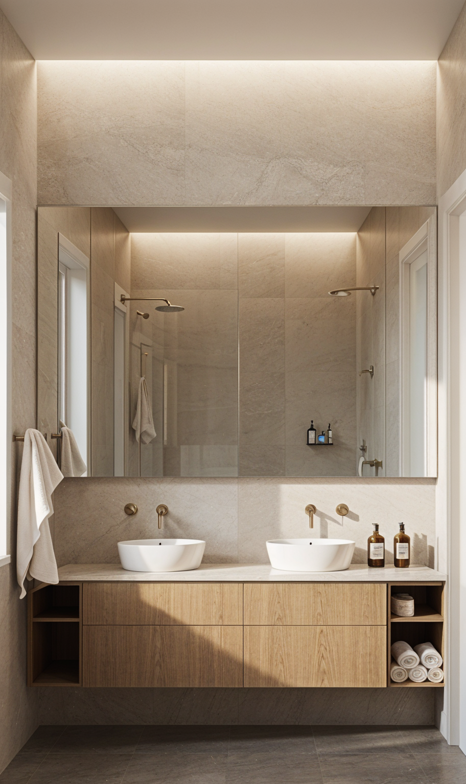preserve tile color lighting comes only from the vanity light with semi transparent scones 3500k mirror backlighting and ceiling fixtures the mirror has a soft white backlit halo 3500k evenly diffused there is no sunlight nor any light source other than the vanity light and backlit mirror overall scene is evenly brightened using neutral 3500k ceiling lighting only do not add highlights glow reflections or new light sources