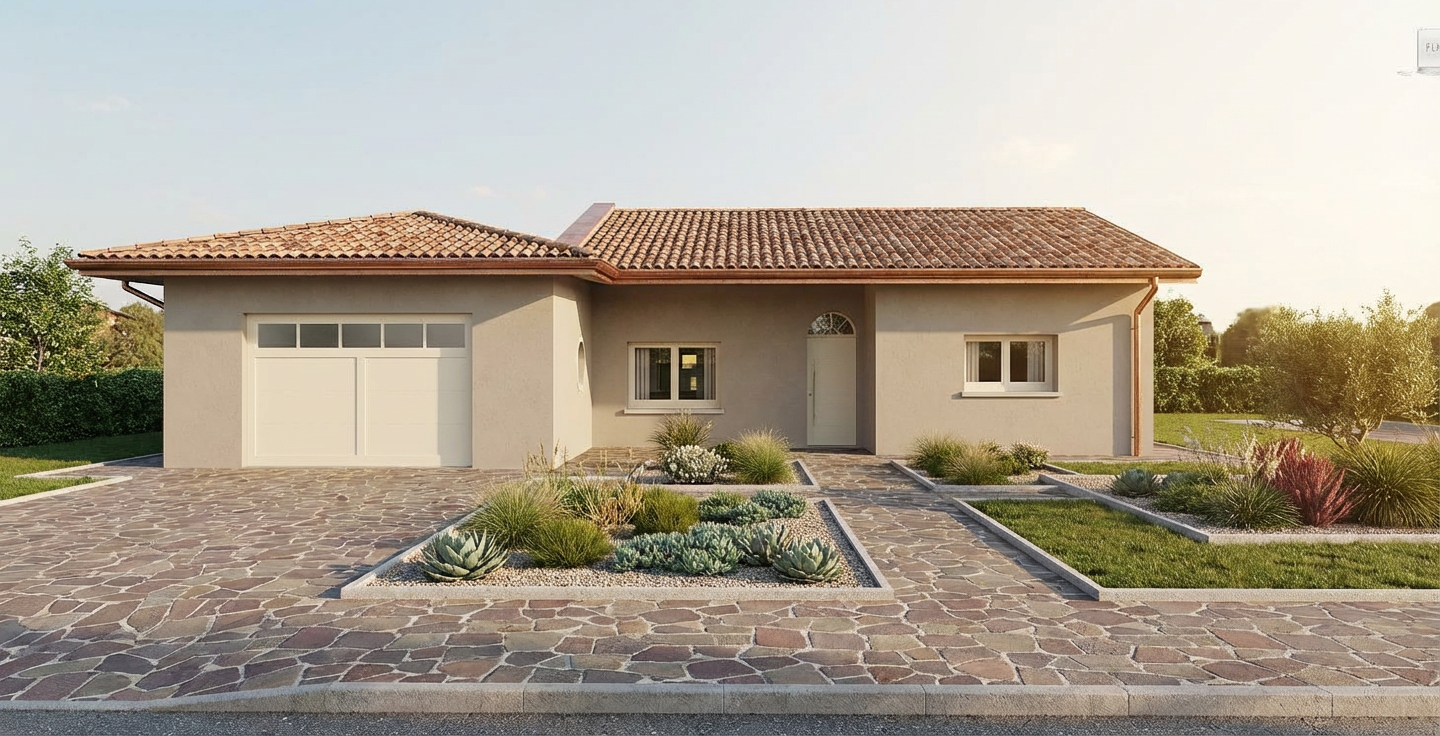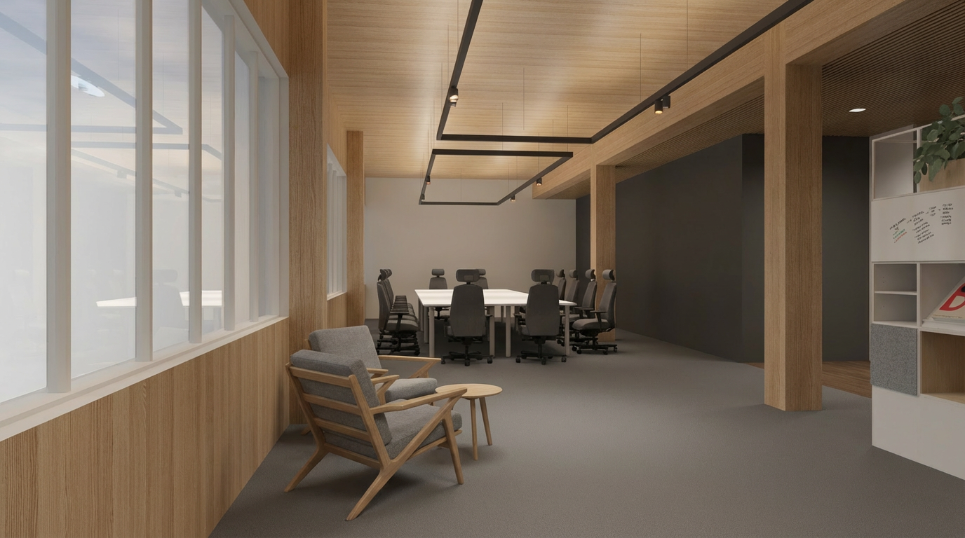 create a modern kitchen interior with a sleek minimalist design use a palette of soft cream and dark charcoal for the walls feature cabinets in light wood tones with textured grains contrasted by matte black appliances incorporate a long dining table with a dark wood finish surrounded by elegant white modern chairs highlight a large vibrant advertisement on the wall showcasing golden yellow fries against a lush green field backdrop install soft ambient lighting creating a warm and inviting atmosphere the ceiling should be a smooth dark gray complementing the room s overall contemporary aesthetic