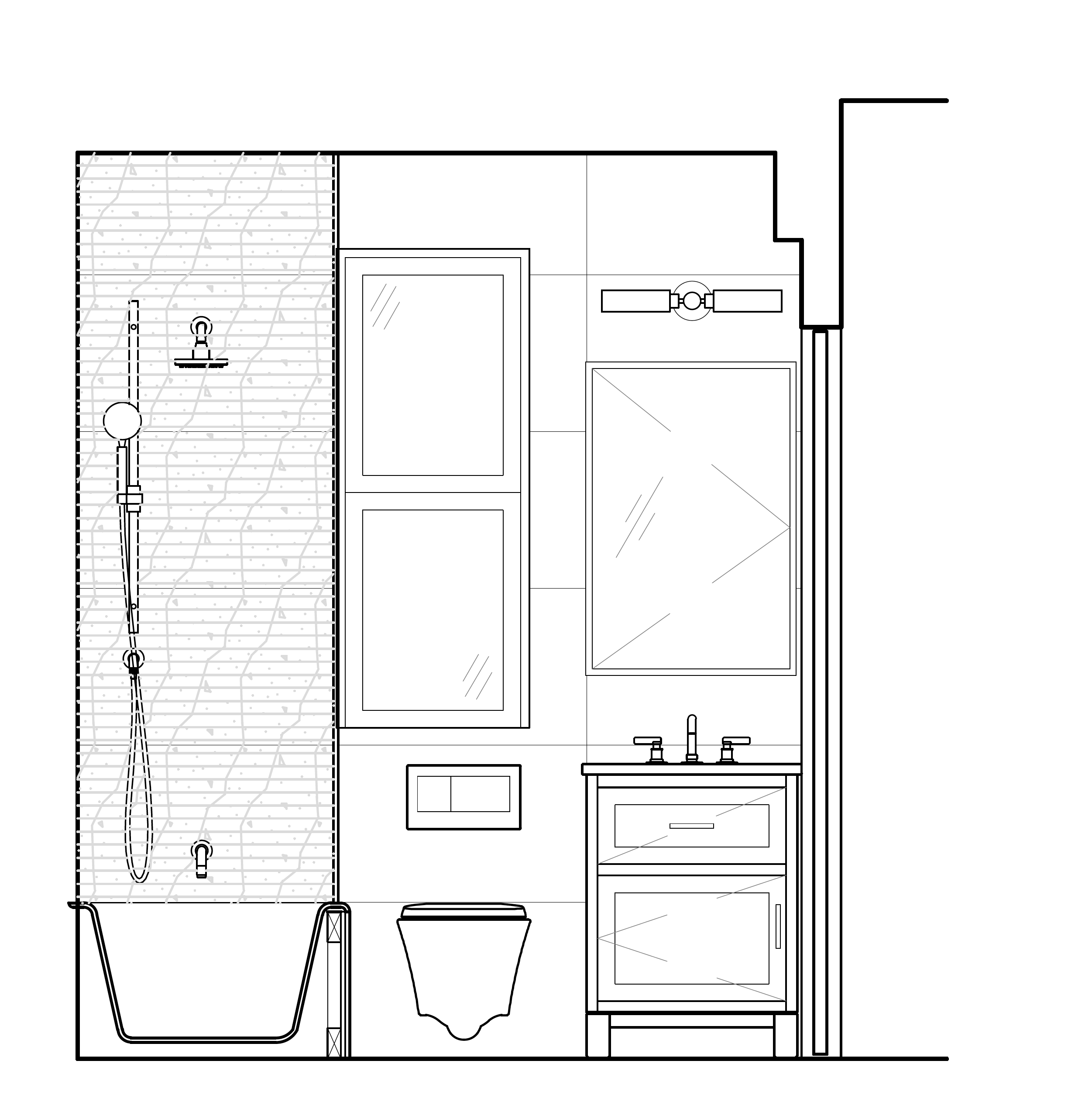 render this bathroom elevation the fixtures should be white the vanity cabinet should be walnut the tile should be a creamy stone add a vague blue sky through the window the faucets should be antique brass