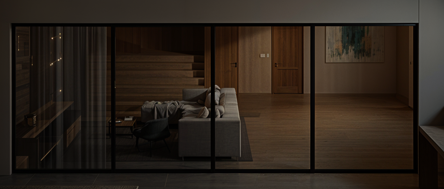 render a luxurious modern living space with high ceilings and large windows the room is illuminated by the soft glow of a sunset casting warm golden and orange hues through the expansive windows inside there are stylish black framed windows the interior design showcases a white marble kitchen island subtly lit from beneath with elegant veining the cabinetry and walls are a clean white contrasting with dark sophisticated black accents such as the rich black stove hood comfortable seating in muted tones harmonizes with the polished light wood flooring a vase with white and green floral arrangements sits on the island the atmosphere is inviting and serene with an emphasis on natural light and clean lines