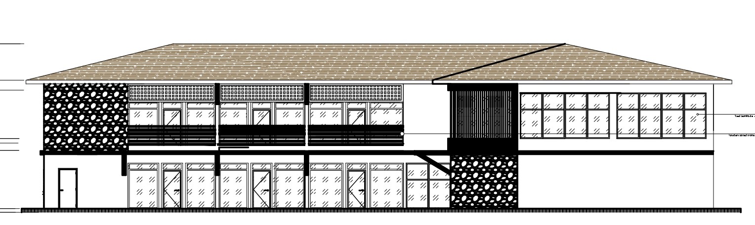 modernist exterior shot commercial building white paint stone wall for hatches brown roofs glass windows balcony water color architecture