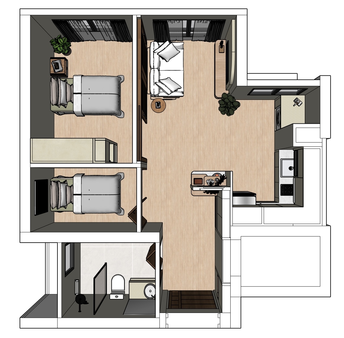 convert this floor plan into a realistic 3d view of a full house show the space from an elevated angle with furniture walls and details visible use the same furniture as shows on the plan do not change the orientation of the floorplan