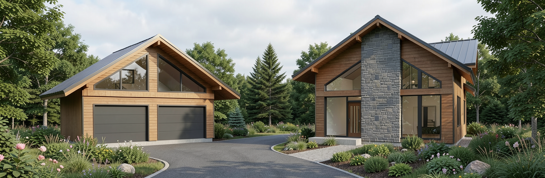 g n rer un rendu 3d photor aliste partir de cette image en conservant strictement et sans modification les couleurs les mat riaux et le sens des rev tements visibles sur l image de r f rence ne pas interpr ter ni remplacer les mat riaux respecter fid lement le bois le rev tement m tallique et la pierre tels qu illustr s teinte texture orientation conserver exactement les volumes et proportions du b timent int grer le b timent dans un environnement naturel cr dible avec une v g tation typique du qu bec utiliser un clairage naturel uniforme et diffus lumi re du jour clairant de fa on gale la maison et le garage avec des ombres douces et un ciel l g rement nuageux ajouter uniquement un chemin d acc s en asphalte menant au garage ainsi qu un am nagement paysager sobre sans alt rer le b timent
