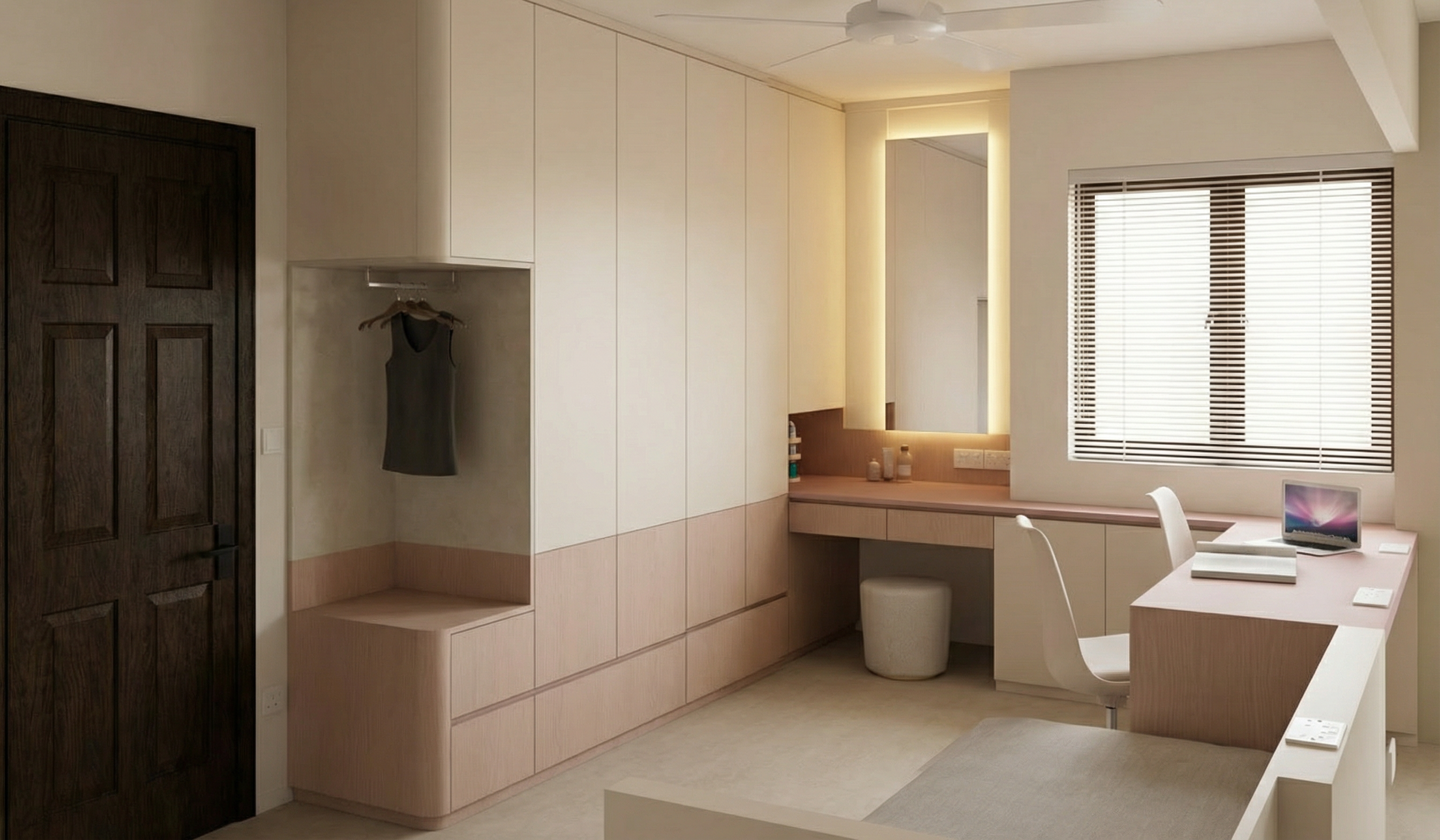 colours to remain accurate as per original given picture wood texture to be subtle dresser top hung middle in mirror wadrobe drawers and table top surface in muted soft pink subtle wood grains niche in light beige microcement and only bottom till study table in warm beige laminate with a soft blush pink undertone and subtle wood grain texture top half of carpentry in solid colour light beige and only bottom till study table in warm beige laminate with a soft blush pink undertone and subtle wood grain texture 2 casement door below window in solid colour light beige ceilng in off white floor in muted light beige vinyl subtle grains 50mm recessed top skirting on top of mirror cabinet ceiling fan in white blinds in white