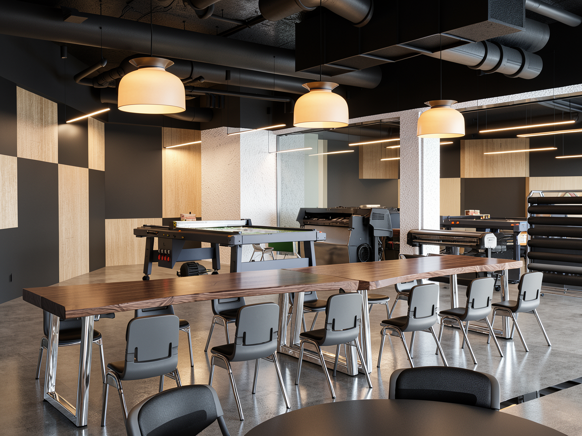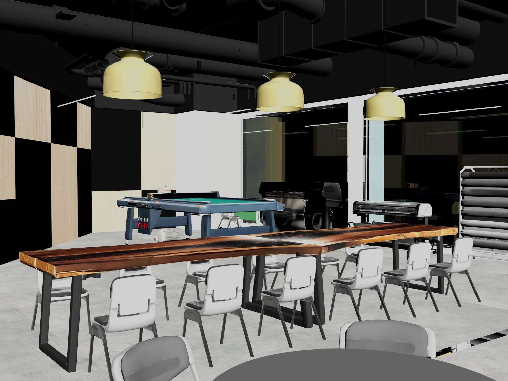 got it here is the final corrected archsynth prompt with table legs explicitly locked to black and with absolute enforcement that no materials or colors are changed beyond what is already visible in the reference image final archsynth prompt classroom strict color material lock hyper realistic architectural interior visualization based strictly on the provided reference image ultra detailed photoreal quality modern industrial classroom interior designed for collaborative learning and technical instruction do not change any colors or materials match the reference image exactly no reinterpretation enhancement substitution or material optimization tables round tables arranged throughout the classroom exactly as shown tabletops remain unchanged table legs are black matte to semi matte finish exactly matching the reference image table wheels casters are black matte rubber no chrome no recoloring no reflectivity change chairs classroom chairs remain exactly as in the image grey plastic frames black upholstered seating and backrests preserve original plastic sheen fabric texture softness and proportions with zero color shift polished concrete floor remains unchanged in tone roughness and reflectivity white textured columns remain identical in color and surface detail black exposed ceiling with visible ducts pipes and mechanical systems remains unchanged teaching and production area includes the plot cutter machine positioned behind the long wooden work counter exactly as visible wood counter retains its original grain tone edge detail and finish no adjustment lighting strict warm pendant lamps and linear ceiling light strips are the only light sources all illumination must originate only from these lamps and strips no added ambient light no daylight no hdr environment override physically accurate light falloff indirect illumination soft shadows and realistic reflections consistent with existing materials absolutely do not change colors materials furniture geometry layout lighting placement surface finishes physically based rendering pbr global illumination ray traced lighting realistic exposure correct white balance sharp focus architectural photography style cinematic realism ultra high detail 8k quality