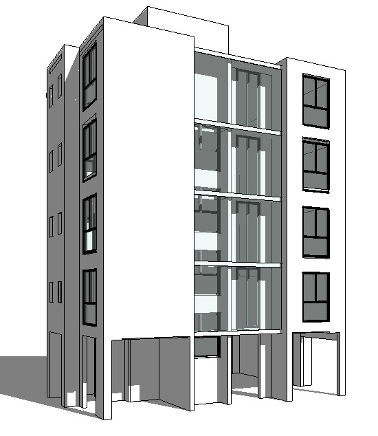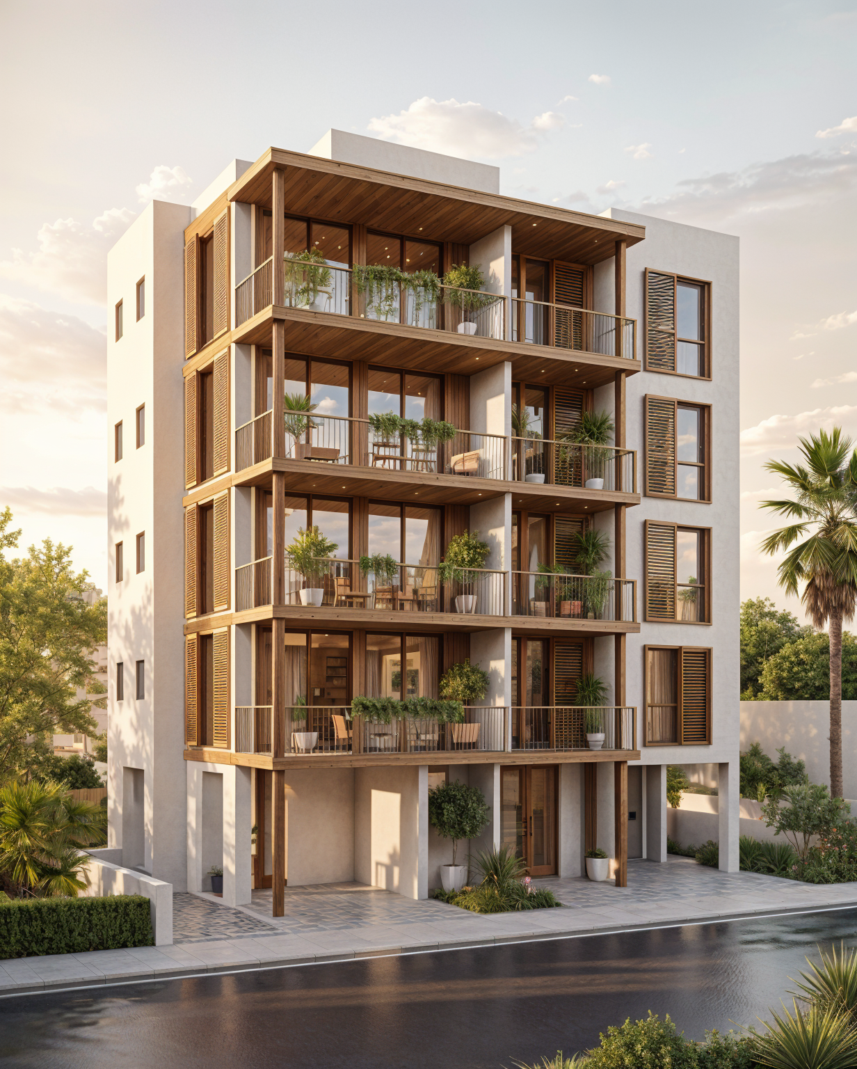 photorealistic architectural render of the rear elevation of the same modern apartment building shown in the reference image the building is a 5 storey residential renovation with a central recessed section containing stacked balconies the balcony slabs are lightweight metal extensions identical to the front verandas with slim steel structure and glass railings matching the design language of the front fa ade across the recessed balcony zone there is a powder coated metal mesh screen painted the same warm white color as the building fa ade creating a semi transparent architectural screen while allowing ventilation and light the fa ade is smooth white stucco with dark aluminium window frames minimal contemporary detailing ground floor with open pilotis columns and parking beneath the building environment with tropical landscaping palm trees clean paved driveway soft shadows golden hour lighting warm sunset atmosphere cinematic architectural visualization ultra realistic materials global illumination highly detailed professional v ray style architectural render 8k quality camera rear three quarter perspective showing the recessed balconies and full height of the building architectural photography with corrected vertical lines