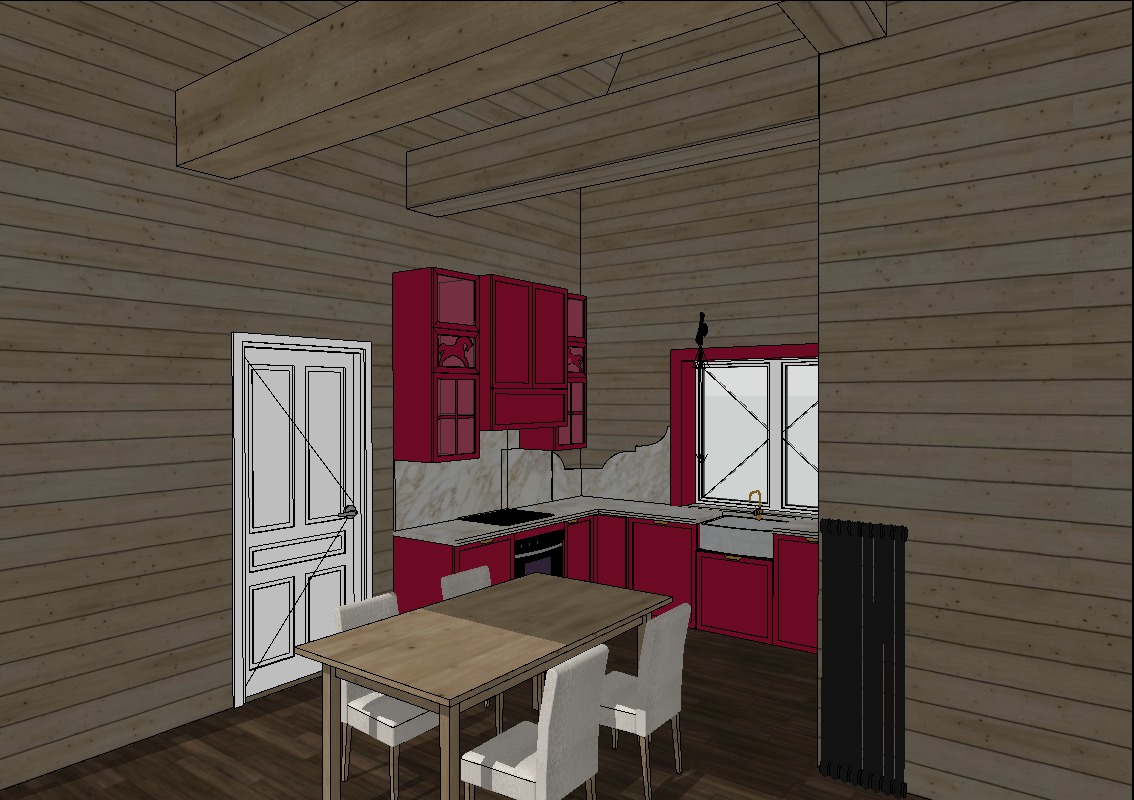 a warm elegant kitchen design in a wooden house deep burgundy shaker style cabinetry painted in ral 3004 creates a rich and classic atmosphere the cabinets feature refined brass bar handles adding a subtle contrast and a touch of sophistication the countertop is made of calacatta gold marble with soft white tones and delicate golden veining enhancing the luxurious yet timeless aesthetic a white porcelain farmhouse sink is integrated into the design becoming a central feature of the kitchen upper cabinets are decorated with delicate horse illustrations adding a unique slightly rustic and artistic character above the window a pair of brass wall sconces provides warm ambient lighting complementing the natural tones of the wooden interior the overall mood is cozy and refined blending classic design with countryside charm soft natural daylight enters through the window interacting with warm artificial lighting to create a balanced and inviting atmosphere