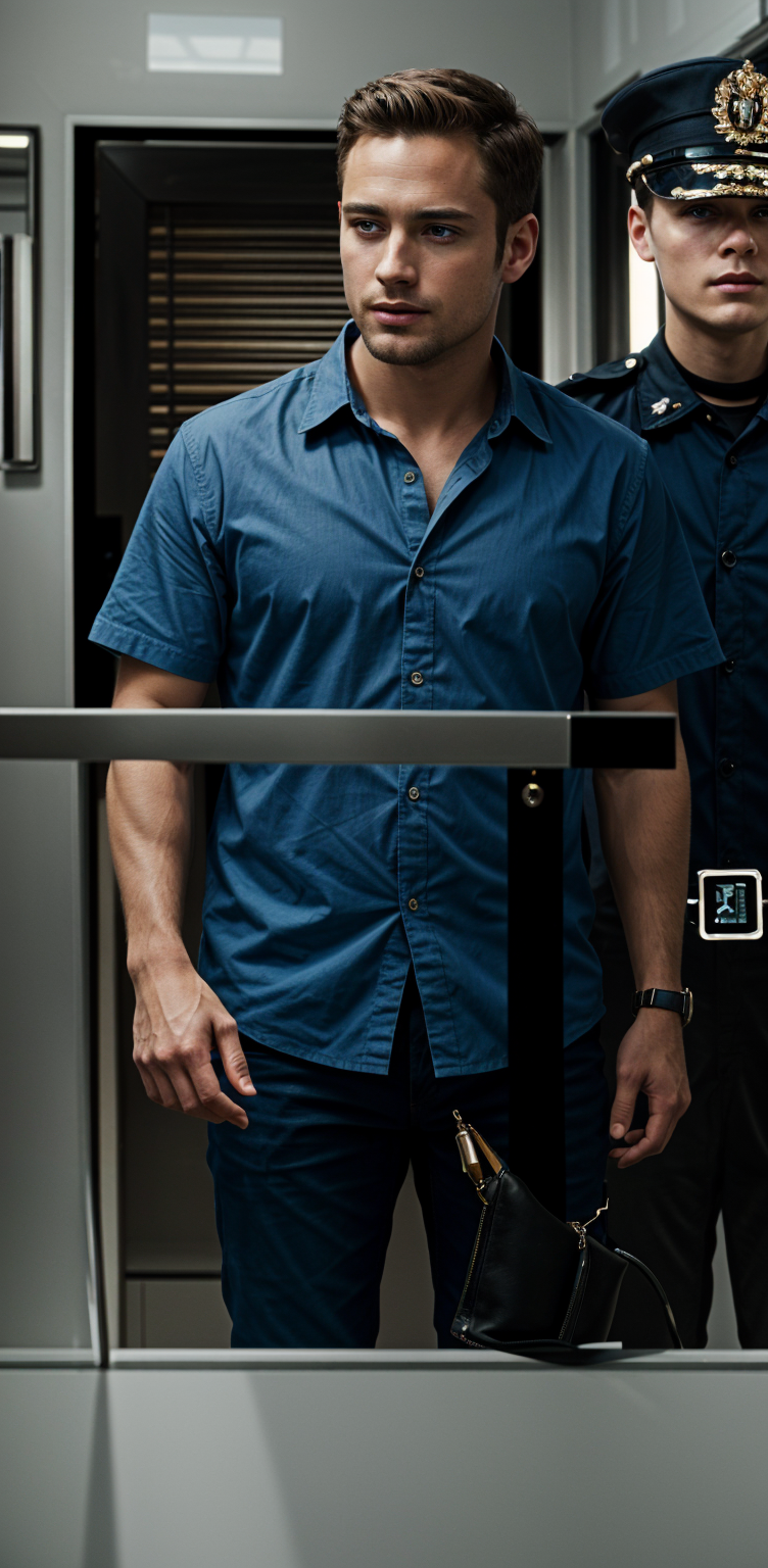 put this man in a blue prisoner s suit with the body and face sideways