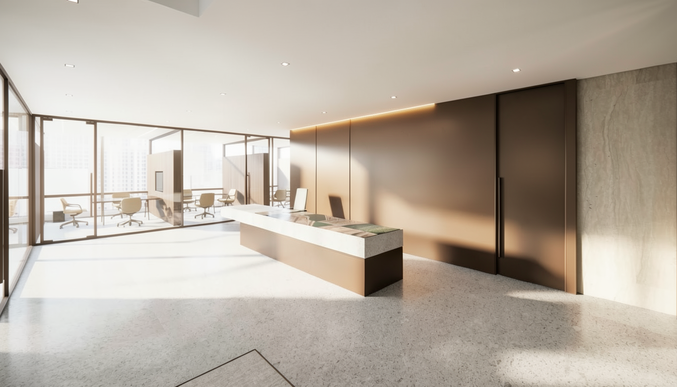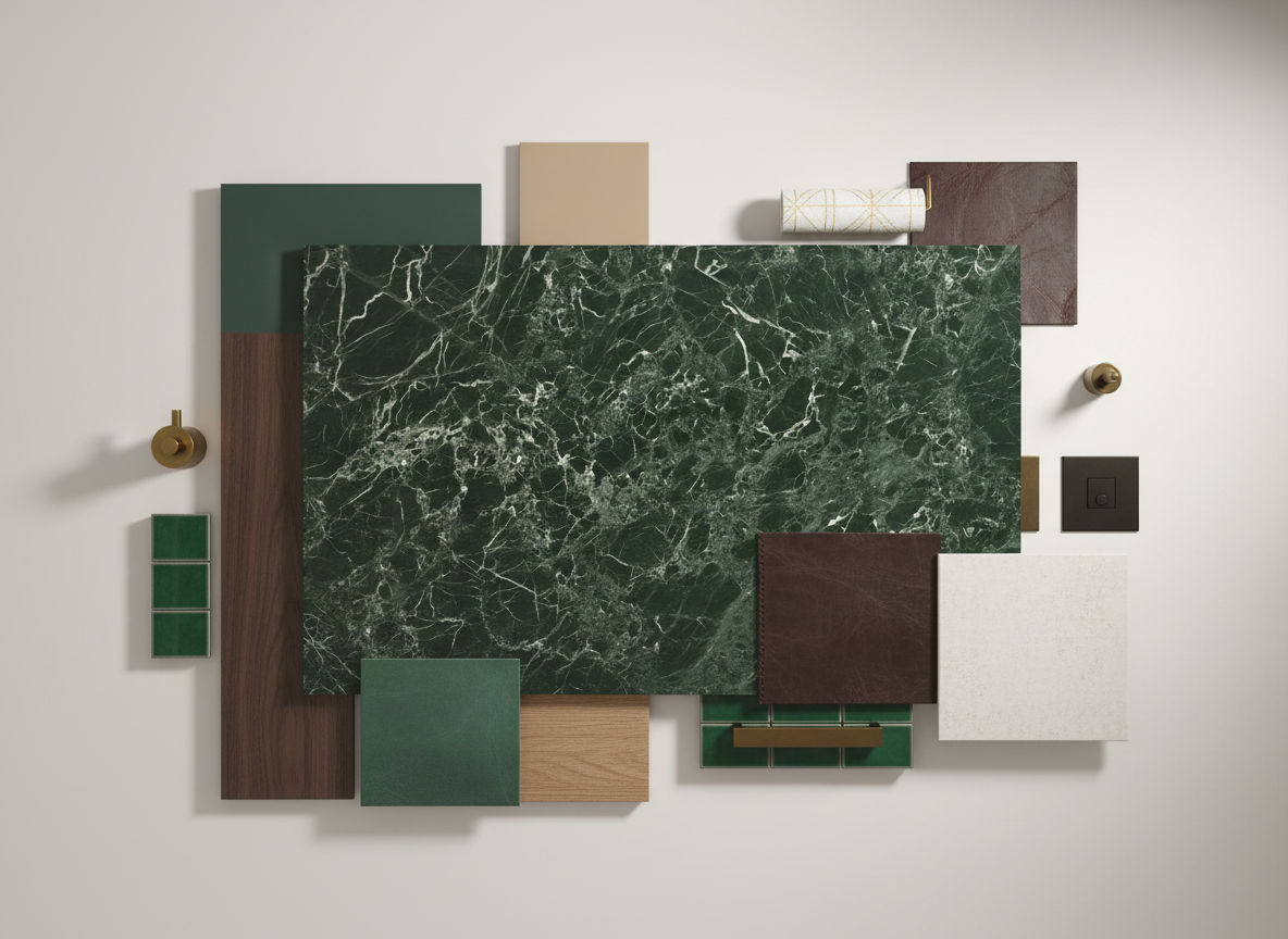 render a high end designer traditional bathroom from the moodboard featuring a slab of verde lepanto marble as the countertop and shower walls show any light fixtures as illuminated and add warm sunlight from nearby windows ensure there are several plants around the space and a companion wallpaper feature behind the vanity