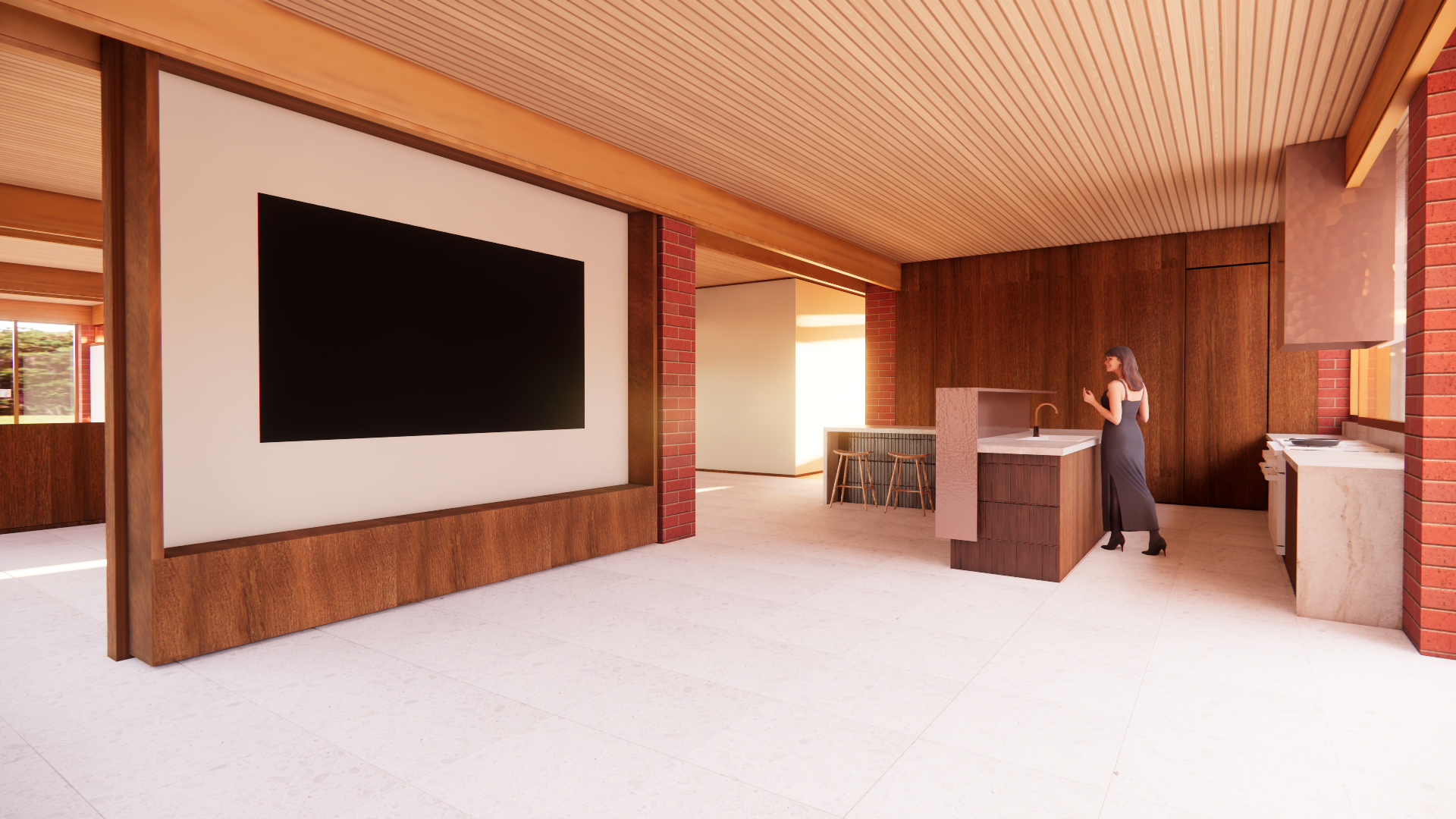 render a photorealistic 3d perspective of this mid century modern masterpiece house keep model geometry the same windows doors roof walls do not change the view or add plants only enhance the current materials and add sunlight on the floor with hyper realistic architectural visualization quality 8k resolution