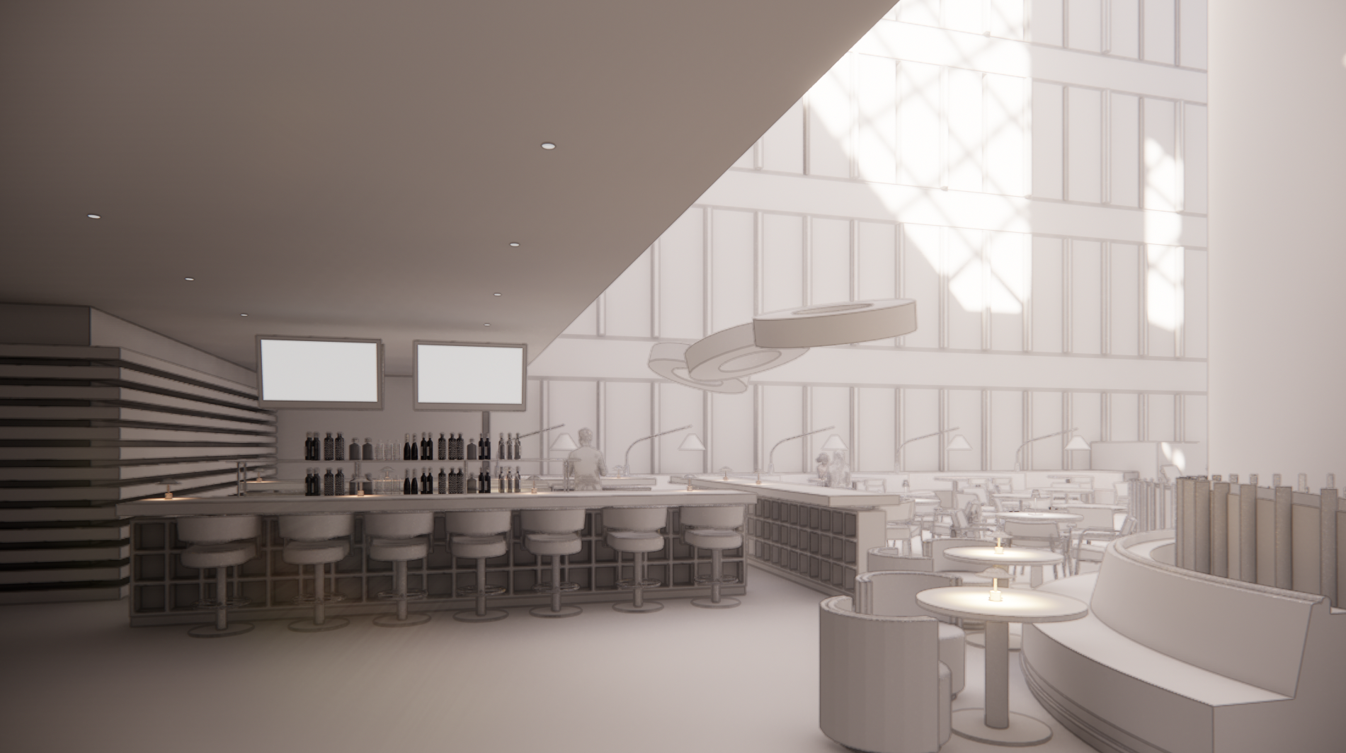 john portman style hotel lobby bar back wall to be fluted concrete with wood fins bar top and squares under bar to be white concrete light fixtures over bar to be made of glowing paper maintain design architecture and proportions of input image