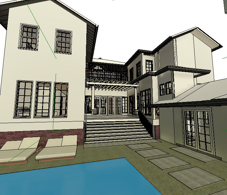 realistic image with dusk sky interior lights turned on realistic pool water potted plants in corners add towels on chaise lounges make windows doors roof rafters and railings white remove upper balcony and railing remove upper railing at balcony remove beams in gable roof make walls white washed brick