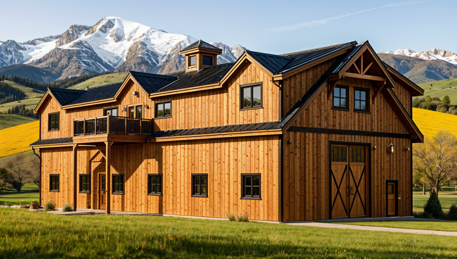 clean architectural exterior rendered in cinematic daylight lighting vertical cedar board batten wood siding with average amount of knots cedar wood barn doors with black trim black metal standing seam roof grass foreground early spring visible tall snow capped mountains in the distant background lush green and yellow rolling hills northern california landscape glass reflections on the windows natural wood textures high fidelity photorealistic visualization crisp shadow falloff refined fa ade geometry richly detailed grain patterns soft atmospheric depth calm minimal landscaping premium architectural photography mood ultra clean composition and materials no grids in windows