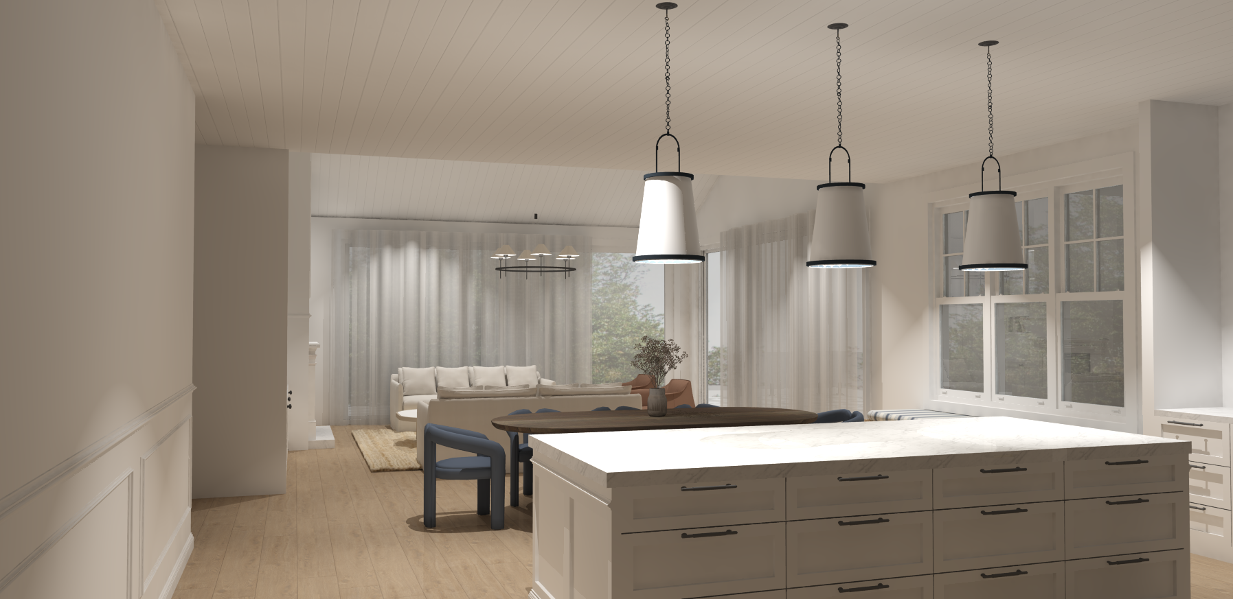 create realistic render benches in carrara marble shades on pendant lights in clear glass make image day time