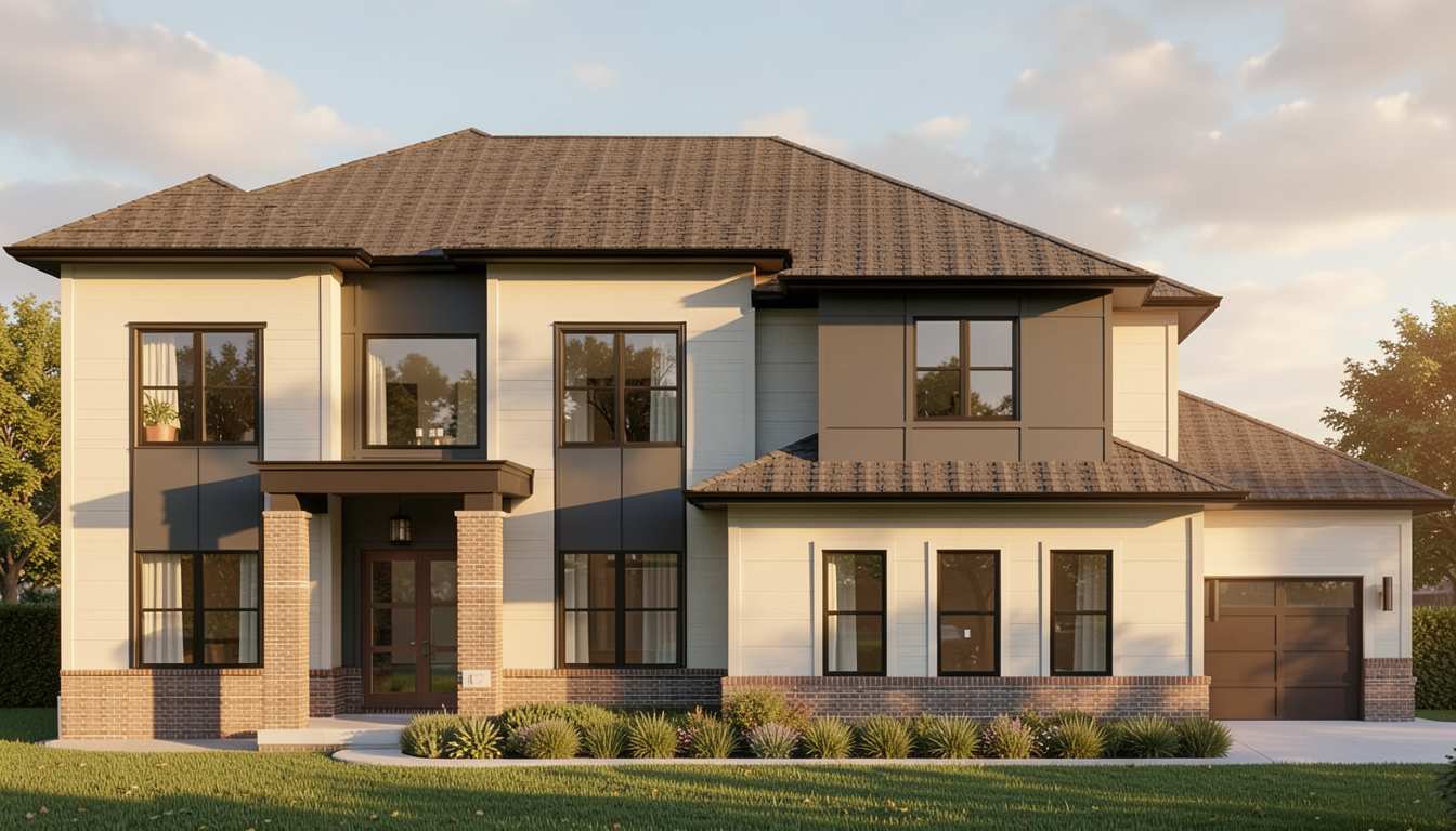 this property is located at 476 main st stoneham ma i need an exterior elevation in 3d realistic format use brick only on the bottom first floor band and hardie panel and lap siding above the first floor