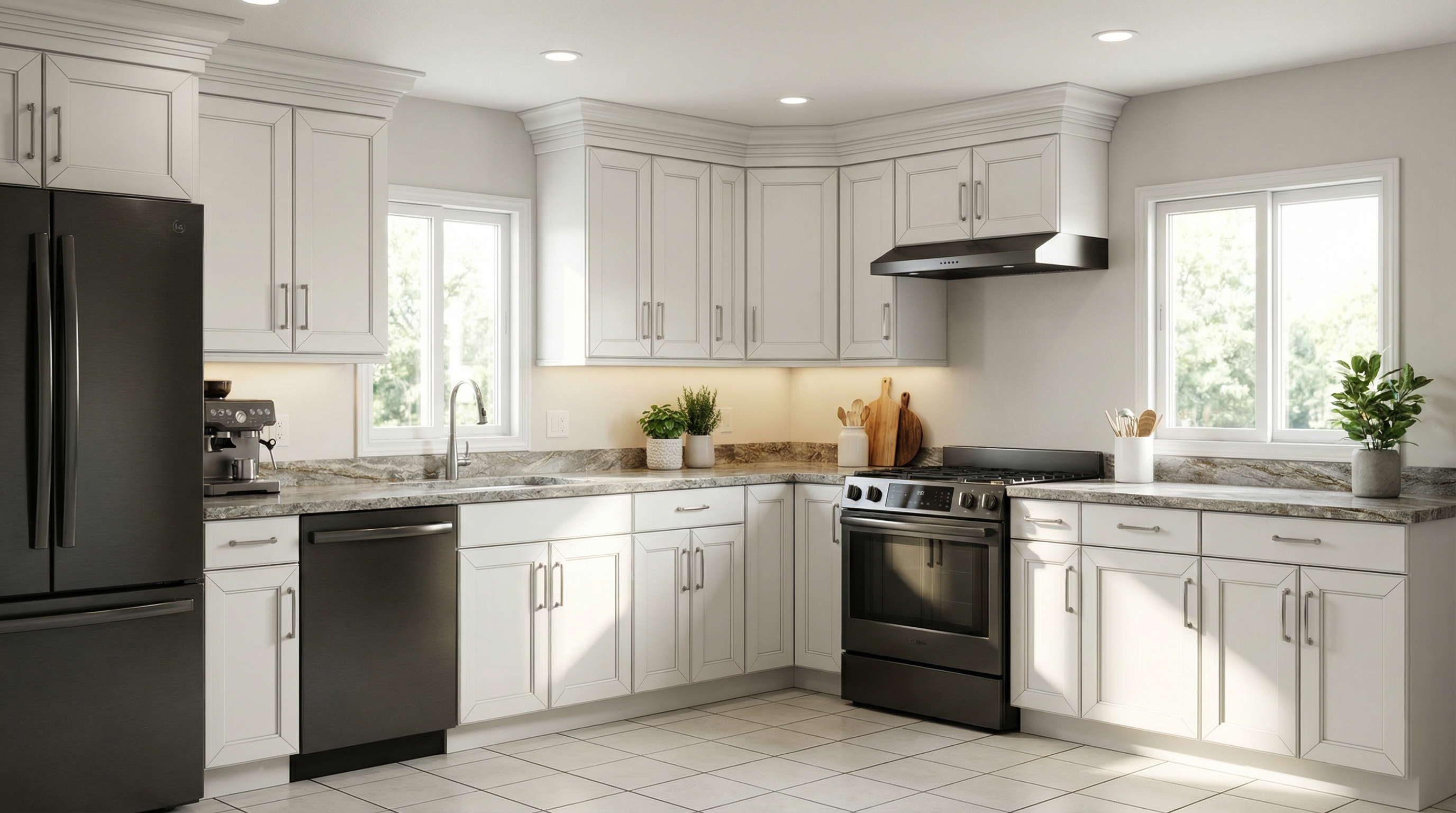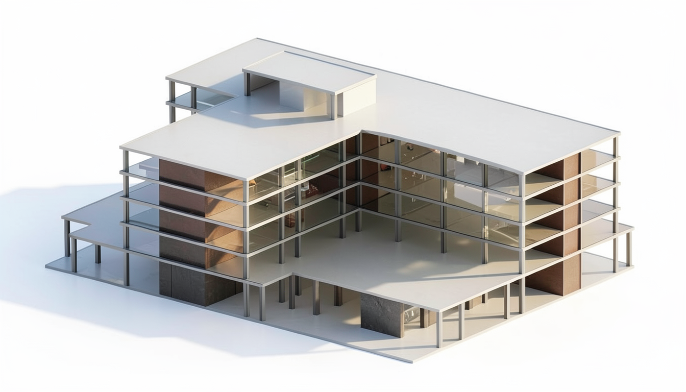 modify the existing 3d building render by increasing the front width from 25 ft to 34 ft while preserving the original architectural design fa ade composition roofline materials windows trims and entrance placement expand the building naturally and symmetrically without changing the style or distorting the geometry convert the existing garage door into a realistic double car garage door that fits proportionally within the widened fa ade add a variety of mature trees and natural landscaping around the building show a neighboring residential building on one side with approximately 3 feet of spacing from the main building integrated naturally into the scene keep the same camera angle lighting shadows perspective and photorealistic architectural rendering quality preserve architectural realism suitable for a professional residential design presentation the timing is on the afternoon and sharp sun