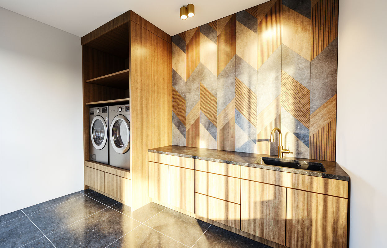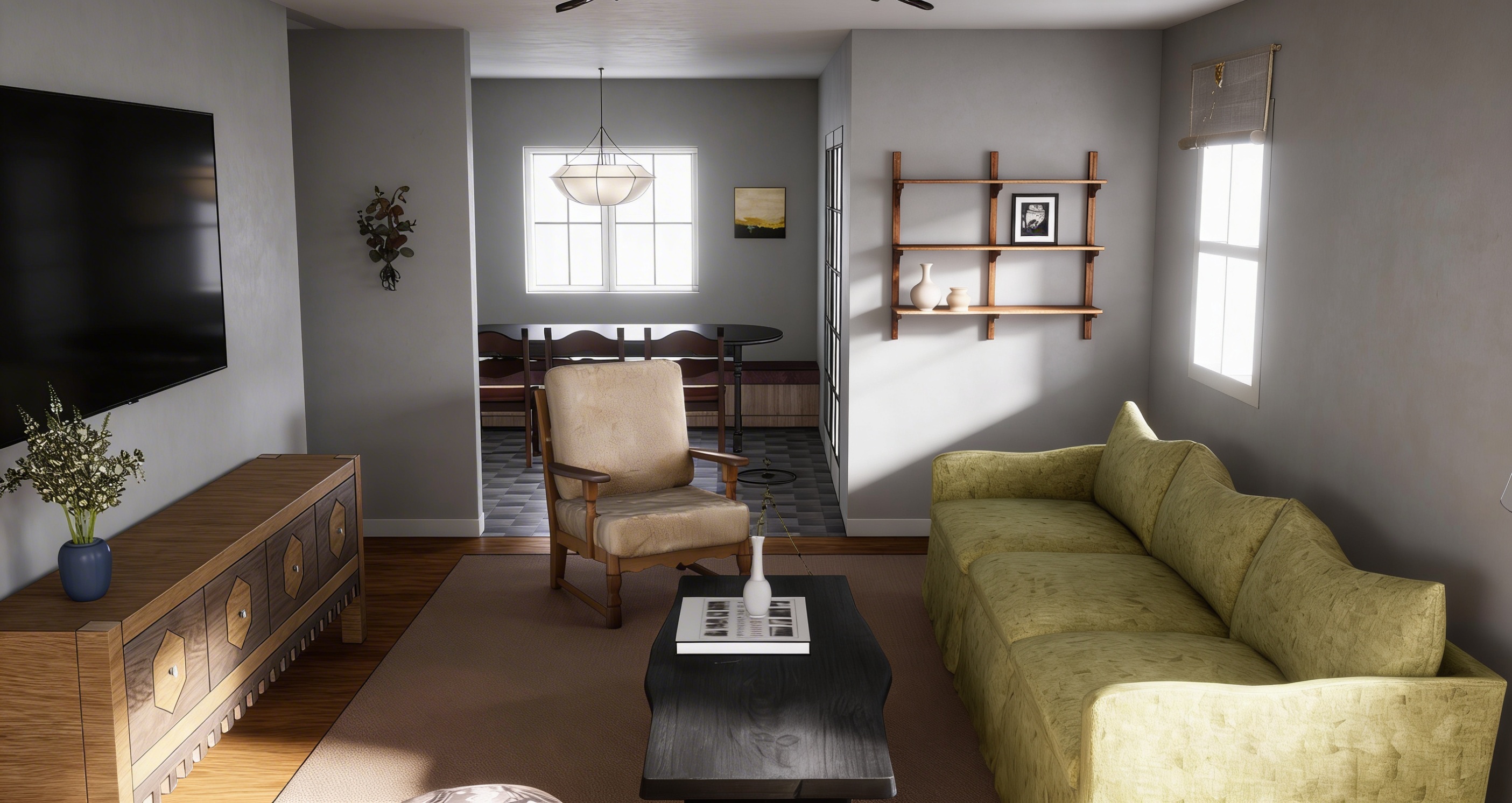 convert this architectural rendering into a highly realistic editorial style luxury real estatephotograph suitable for marketing and listing imagery maintain the exact architecture layout geometry cabinetry layout window placement andproportions exactly as modeled do not redesign restyle or modify the architecture or cabinetry do not move or adjust cabinets appliances islands windows or walls enhance realism only through natural lighting accurate material texture subtle reflections andsoft shadow depth the image should feel like a professionally photographed architecturaldigest style interior used for luxury real estate marketing materials in the space include builddirect engineered wide plank flooring in seashore finish walls and ceiling painted origami white by sherwin williams cabinetry featuring a natural stained woodcabinets countertops and backsplash in silver root honed quartzite with soft slightly warm tonesthe wood flooring should show authentic grain correct plank scale subtle tonal variation and anatural matte sheen the natural stained wood cabinetry should show realistic wood grain depth natural variation and refined craftsmanship white cabinetry should appear clean crisp and softly illuminated with natural shadow lines atthe doors and panel details the silver root honed quartzite counters and backsplash should appear natural and refined with softmovement and subtle warm tonal variation not overly glossy or artificial natural light should be softly entering through the windows in an editorial architecturalphotography style creating gentle highlights natural interior bounce light and subtle shadowdepth throughout the space the furniture and decor shown in the rendering should be treated as placeholders and replacedwith high end restoration hardware and pottery barn style staging elements appropriatefor a luxury kitchen inside the glass upper cabinets add very minimal restoration hardware style styling only afew carefully placed objects should be visible such as a small stack of neutral ceramic plates a few simple glassware pieces one refined serving objectthe glass cabinets should remain mostly open and uncluttered maintaining a clean high endappearance add subtle kitchen staging elements such as a neutral stone or ceramic bowl a refined serving tray or board a small stack of curated cookbooksall staging should remain restrained and minimal so the architecture and cabinetry remain thefocus the final image should appear highly realistic refined and editorial similar to a luxuryarchitectural digest feature or professionally photographed high end listing do not alter architecture cabinetry layout appliances materials geometry or design onlyenhance realism and staging