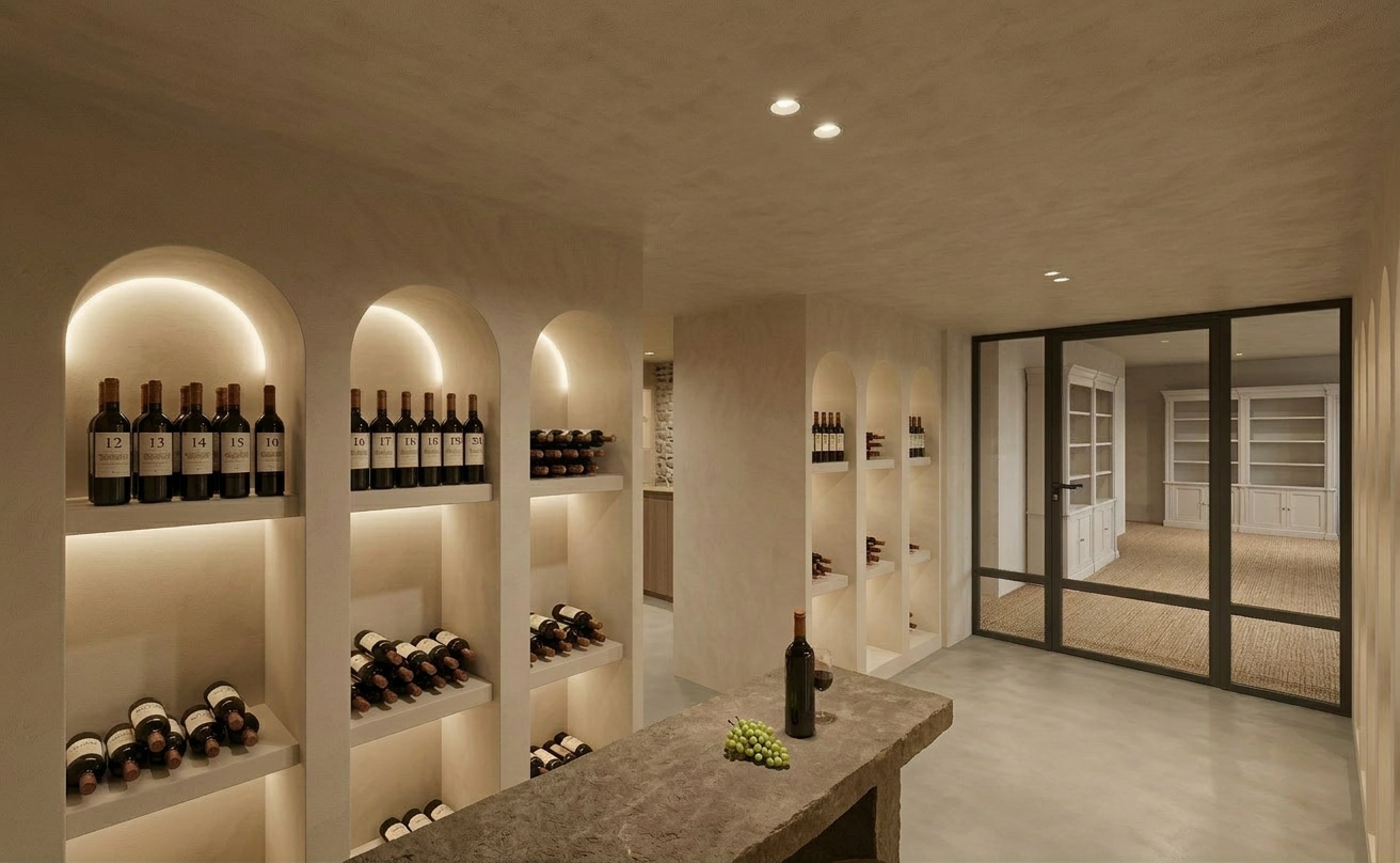 a photorealistic architectural rendering adjustment where two elegant wine glasses and one wine bottle are added on the central tasting table the objects should appear natural and subtly arranged as if prepared for a tasting moment bringing a small sense of life to the scene the glasses are transparent and refined and the wine bottle is placed casually on the table maintaining the minimal and elegant atmosphere of the wine cellar while keeping the exact same table materials position and proportions