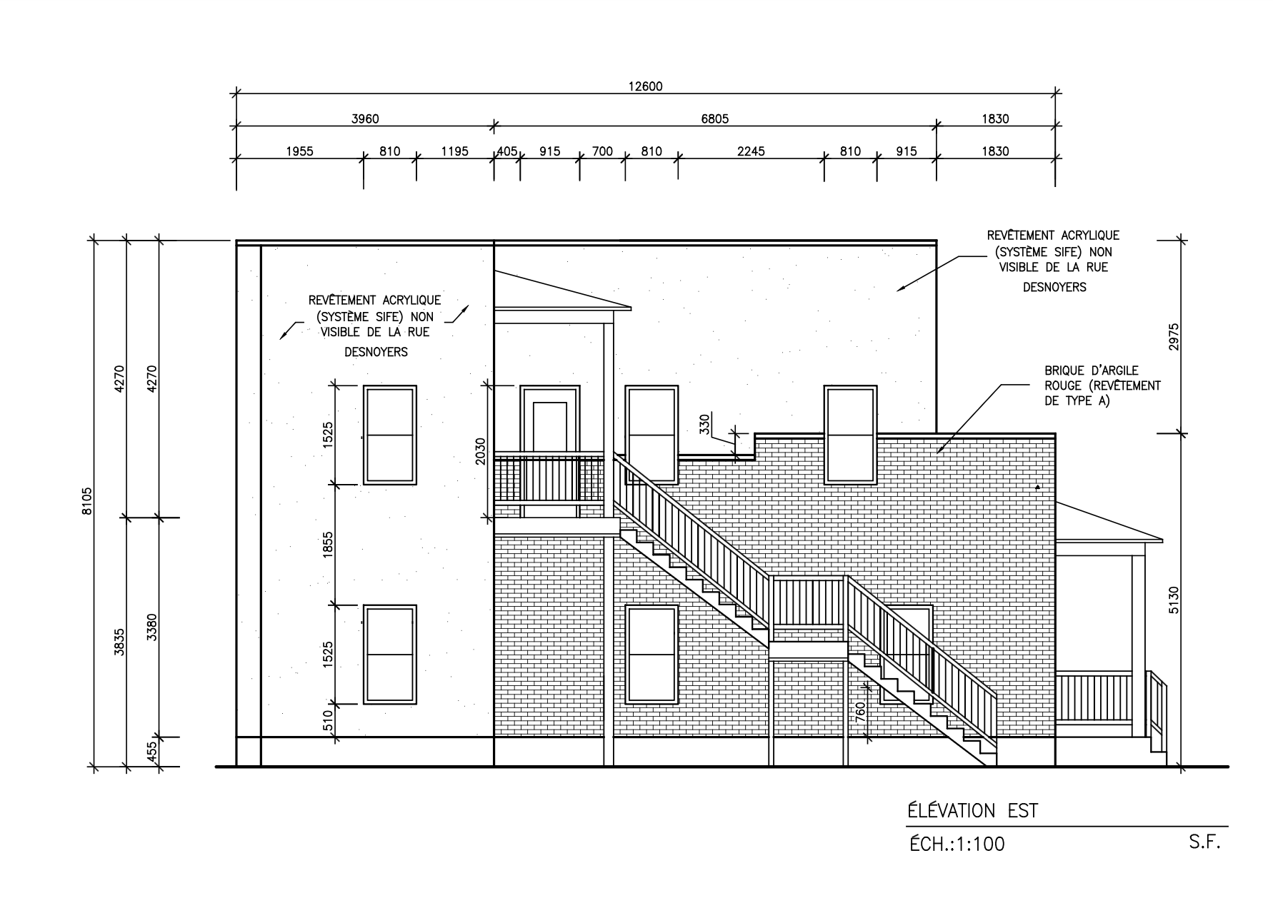 brick need to be red like traditionnal montral red bricks windows and doors white all aluminium siding withe outside stairs are glass fiber color grey and the acrylic finish are grey also