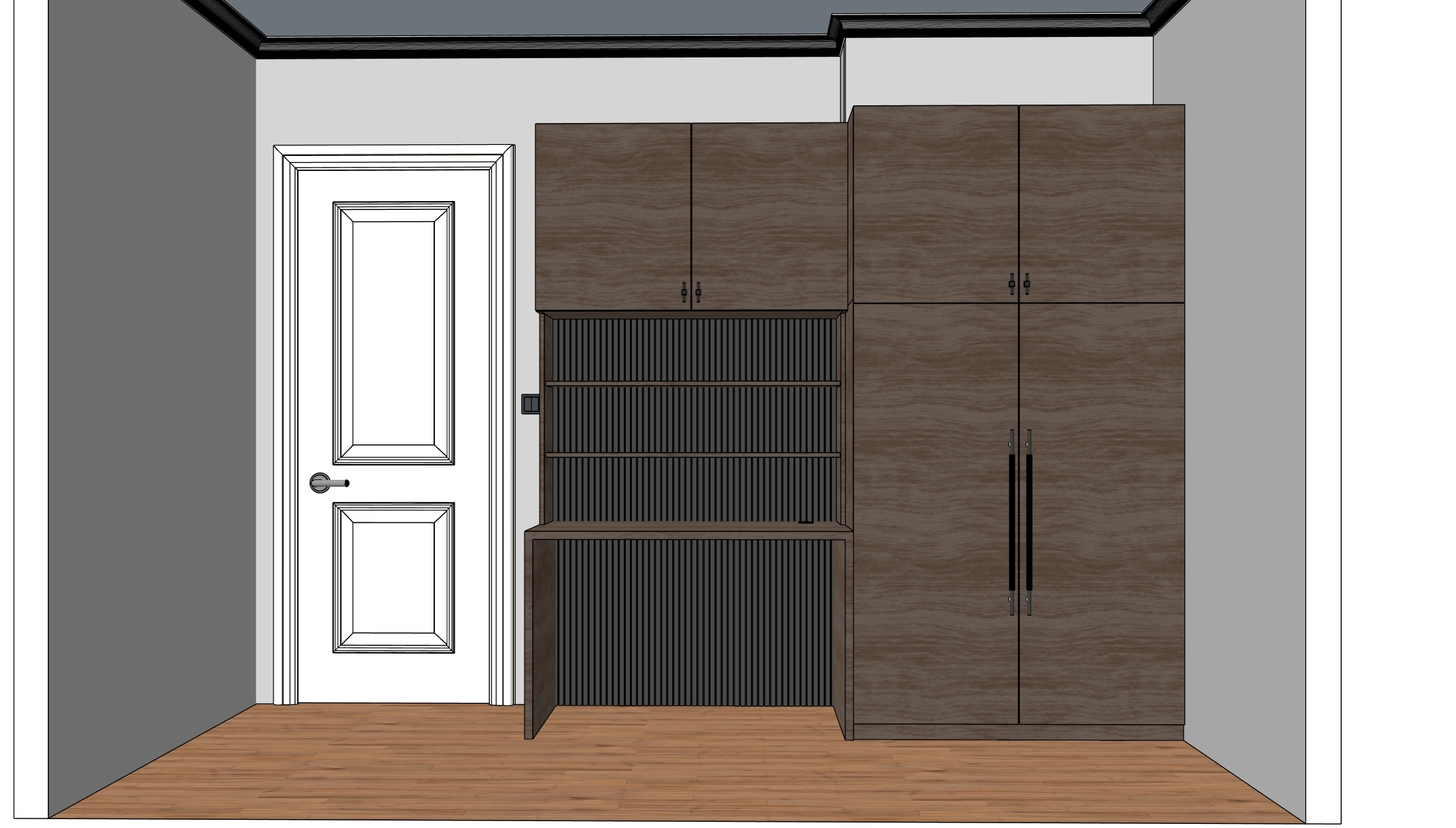 without changing the design render this image and add accessories to the desk make the material realistic add led strip under the shelves