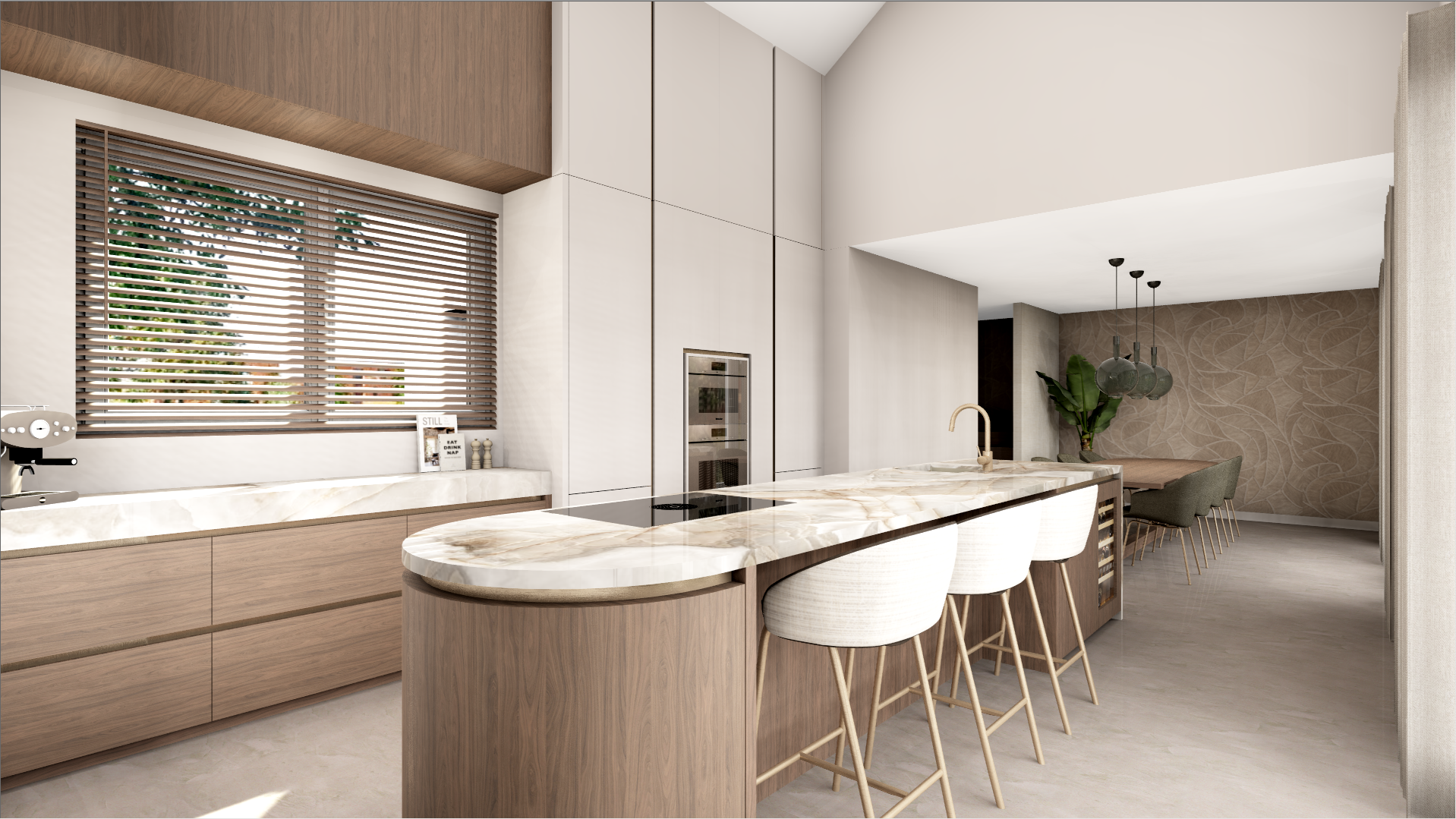 enhance this image to ultra photorealistic quality preserve the exact geometry proportions layout materials colors textures and all design details exactly as shown do not add remove redesign restyle or reinterpret anything do not change materials colors lighting direction furniture dimensions or composition no new objects no decorative additions no artistic reinterpretation only improve realistic lighting natural shadows material realism true to life surface rendering reflections depth and camera realism high end architectural photography quality the final image must be a 1 1 faithful photorealistic version of the original design you have to change one thing the countertops have to be light emerald green quartzite in stead of the light marble