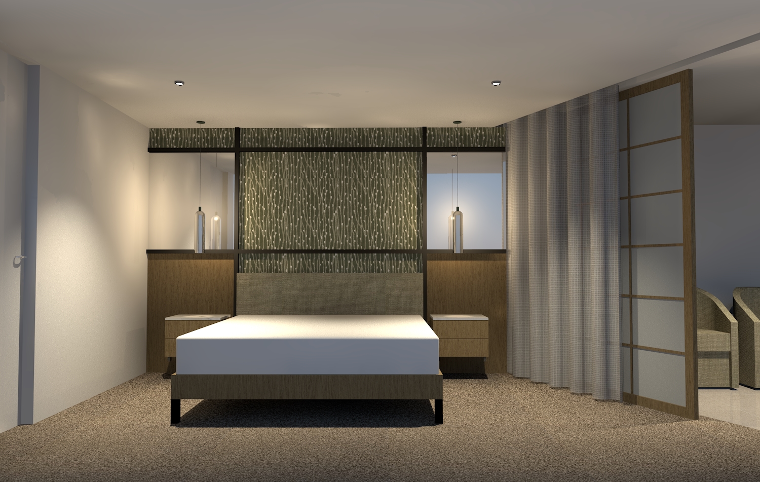 keep all colors and textures the same provide extra plush bed linen and pillows provide medium size modern abstract medium sized painting centrally above bed a person standing outside door