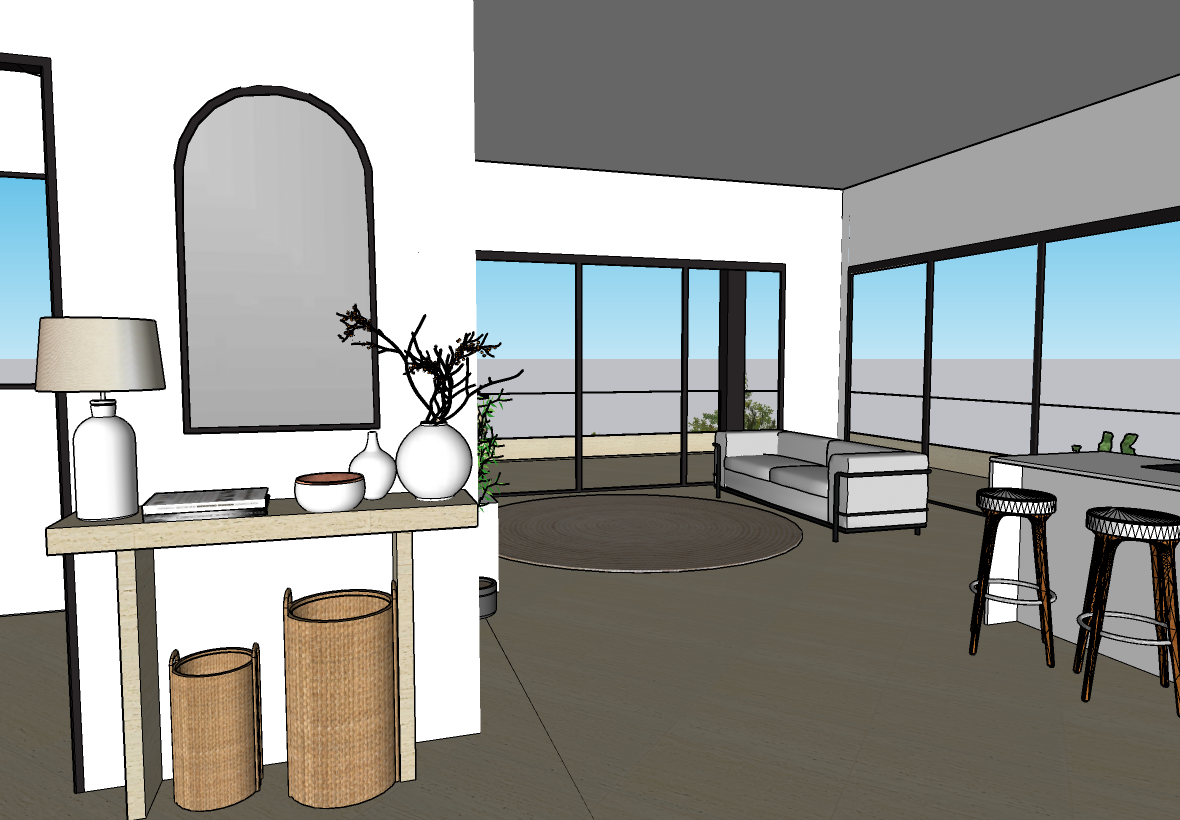 a beautifully rendered modern kitchen interior with a serene and cozy atmosphere the walls are crisp white the floor has a light oak wood texture the minimalist kitchen cabinets are pure white with a glossy finish the bar stools feature a dark wooden base with beige cushions the console table is a light natural wood complementing the woven basket underneath the table lamp has a soft beige shade and the vases are matte white and soft terracotta a blue sky and a turquoise ocean view on the horizon is visible through the window bringing in natural light a jute rug is in the centre of the room overall the ambiance is modern inviting and harmonious with neutral and warm tones