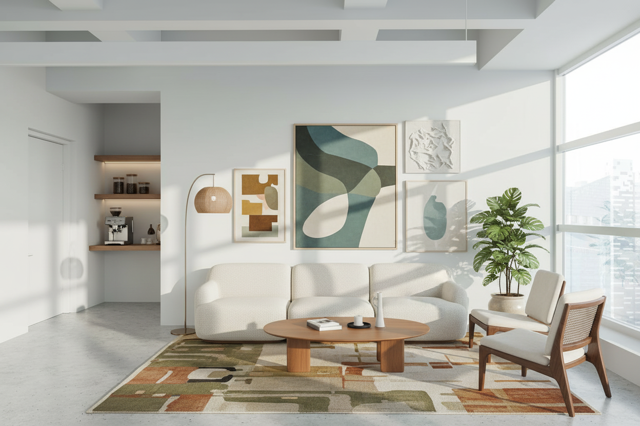 minimalist bathroom interior floor walls and vanity unit in very light beige polished concrete seamless surfaces soft natural light warm and neutral tones refined contemporary architecture clean lines high end materials calm and elegant atmosphere realistic textures subtle shadows architectural photography style ultra realistic render add artifical light