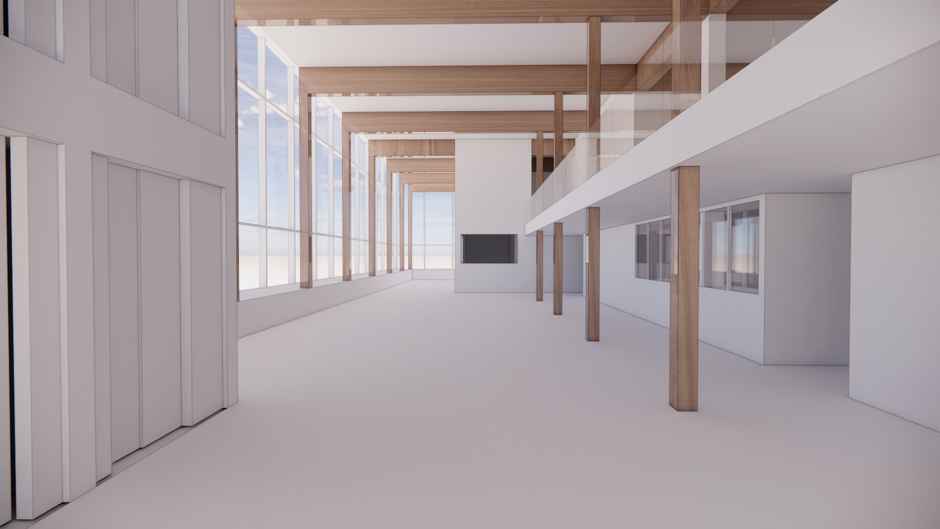 please put the flooring reference picture attached also please do all the listed requirements precisely put perforated stainless steel panels on the big central volume create a see through on the black rectangle opening so that we can see throught the windows remove the upper wood pilars on the mezzanine add a bar on the right with bar stools and hanging light handed onto the ceiling of the mezzanine slab add a long and confortable velvet and wood restaurant bench alongside the bottom of the glass walls add 2 persons rectangular dining tables square of 80cm x80cm with bistrot armchairs in stainless steel and beige fabric on the right where is windows on the wall please replace by a see through cave vin furniture built in with a base in stone and the rest like a vitrine in glass with bottle of wine behind the volume in the middle is and open kitchen the small rectangular oepning use the image of ref to put cook behind the counter to serve poeple