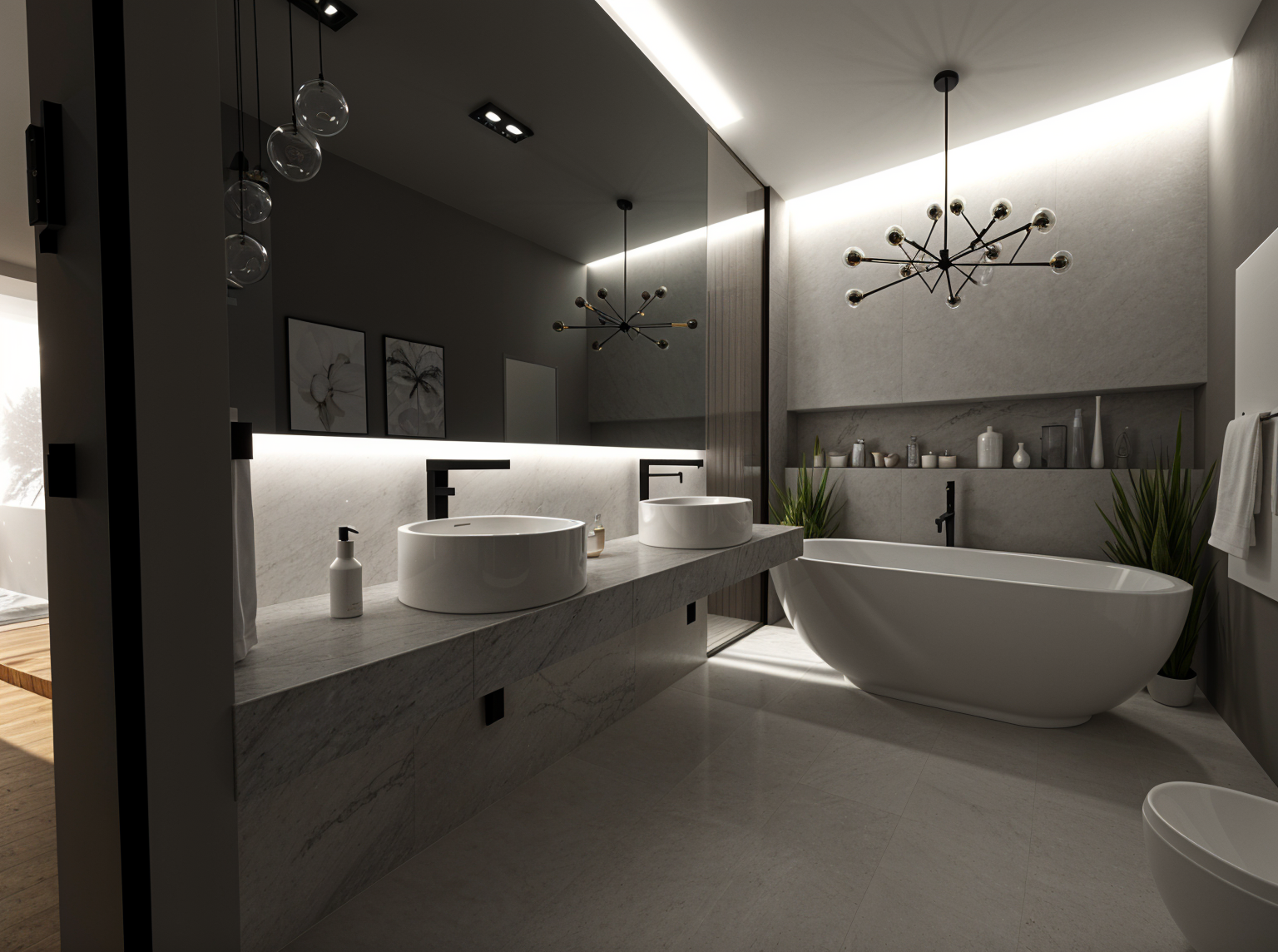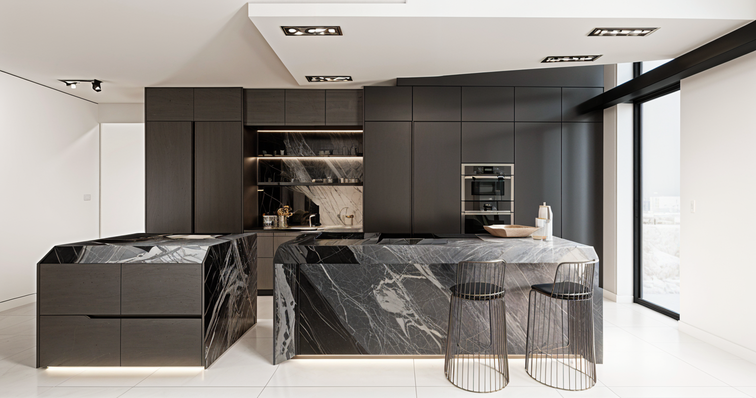 cabinetry doors are anthracite metal with machined bronze tints marble is blue malavita with stunning grey black and blue veins with a high gloss texture undershelf warm led lighting plinth led lighting miele integarted appliances natural daylight setting