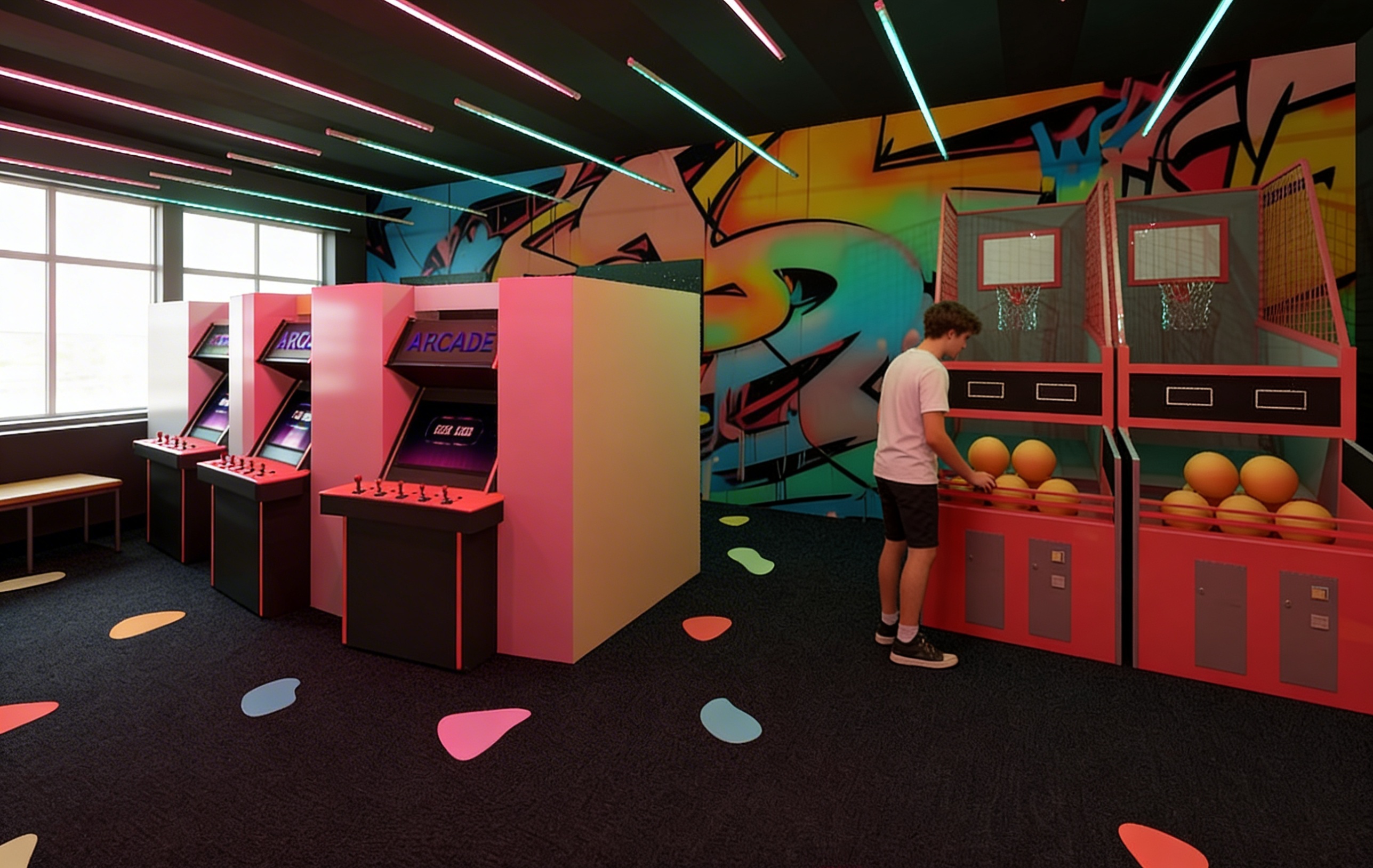 add human teen figure at the arcade games without changing any materials or anything about the image maintain colours