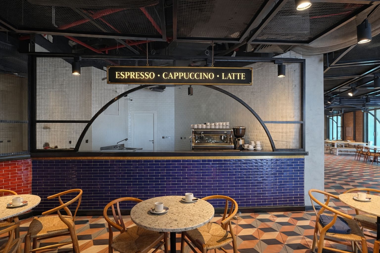a luxury small qatari fast food restaurant elegant modern arabic heritage design refined wood panels subtle sadu patterns ambient warm lighting stylish arabic lanterns minimal decor
