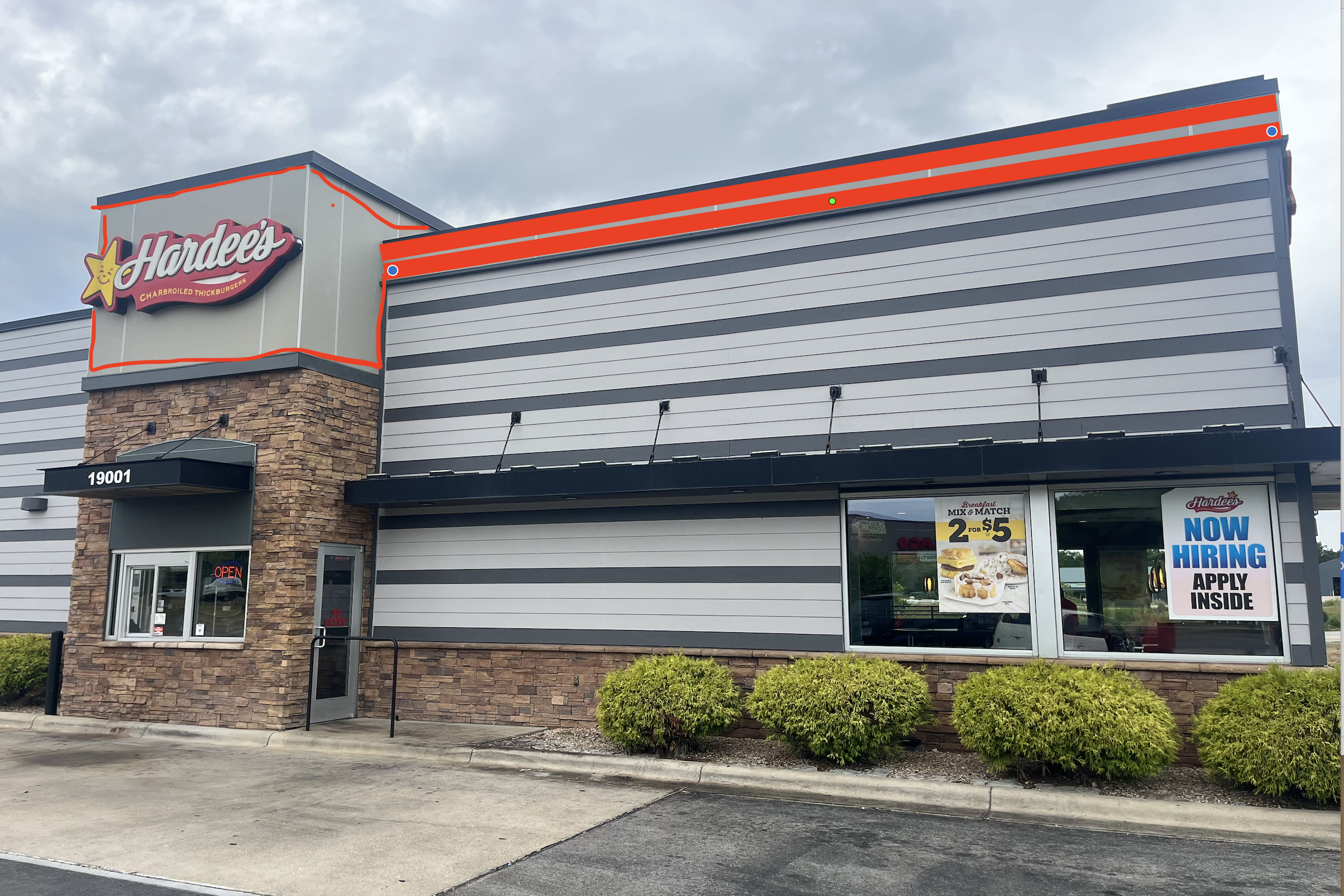 change the top band of the building and behind the lettering that is marked red on photo to a be painted red like the red in the lettering architecture
